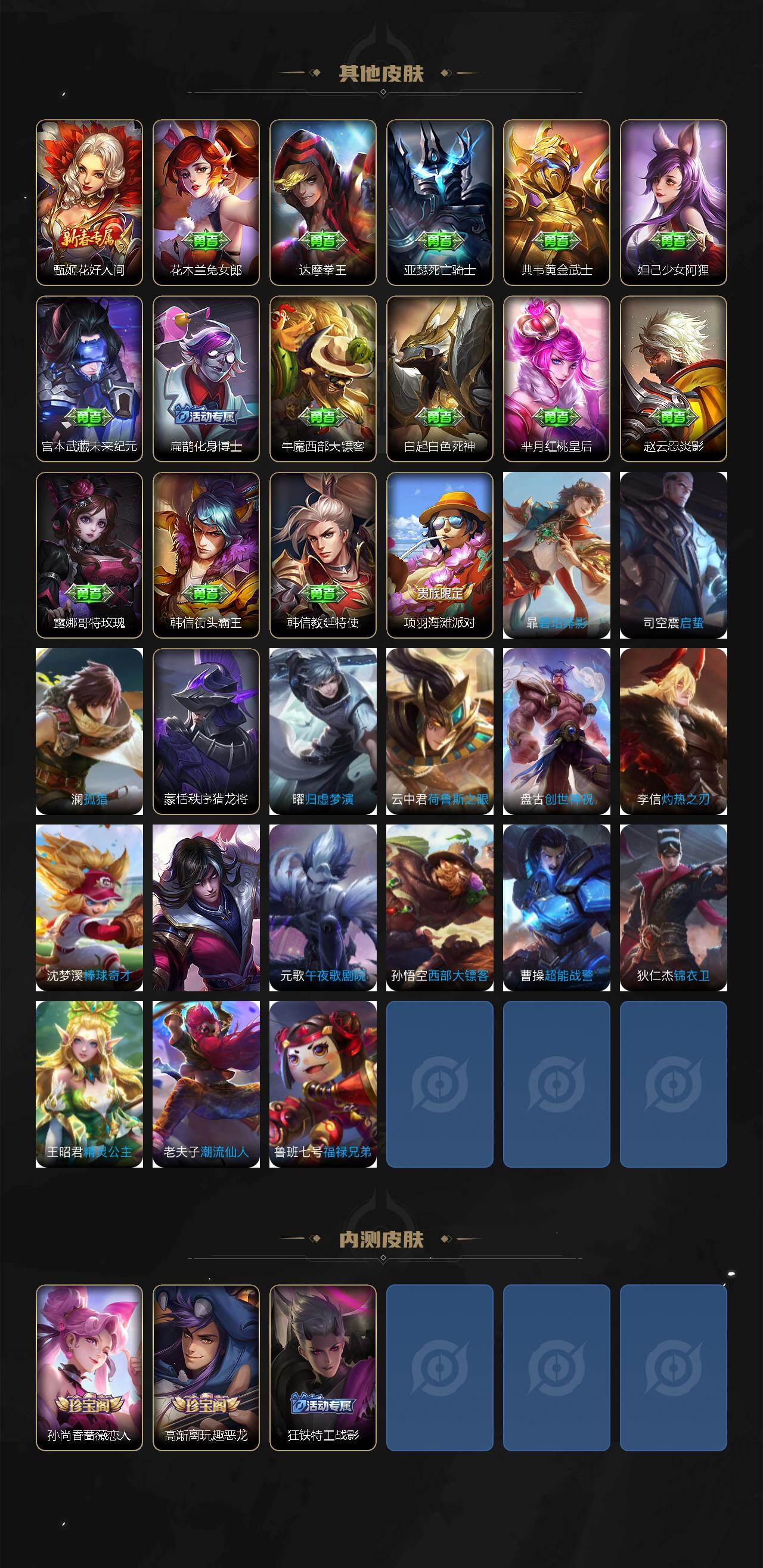 【传说皮肤】:狄仁杰神骥赴朔漠,司空震愿照山河定,澜愿照九州拓,云缨幻光神枪,宫本武藏惊梅引,马可波罗妄想实况,东皇太一灼幽烈阳,李信山海炽霜斩,吕布怒海麟威,马超无双飞将,赵云淬星耀世,曜李逍遥 ,李信一念神魔,刘备时之恋人,干将莫邪久胜战神,达摩黄金狮子座