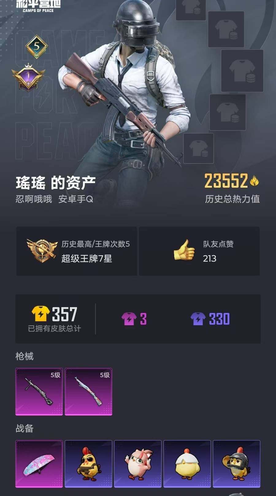 91套装/枪械2/装备107/战备66/王牌印记5/热力值23552/五级Kar98K-巳巳如意/五级DP-28-豹影疾电/套装-龟仙人/Kar98K-巳巳如意/DP-28-豹影疾电/炫彩糖果降落伞/龟仙人/巳巳如意/角色-绯色魅影/AKM-破晓战魂/AKM-龙的传人/M16A4-红色方程式/SCAR-L-夜灯/SCAR-L-炫彩节奏/SCAR-L-红色方程式/M416-糯团青竹/M416-红色