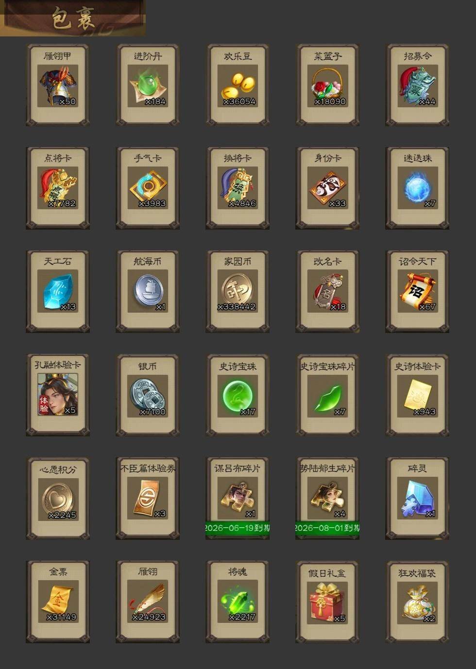 官阶:大将军;VIP等级:VIP13;史诗武将数量:64;动态皮肤数量:57;武将总数:416;史诗宝珠数量:17;将魂数量:2217;神将:12;魏国史诗武将:35;蜀国史诗武将:12;吴国史诗武将:13;群史诗武将:16