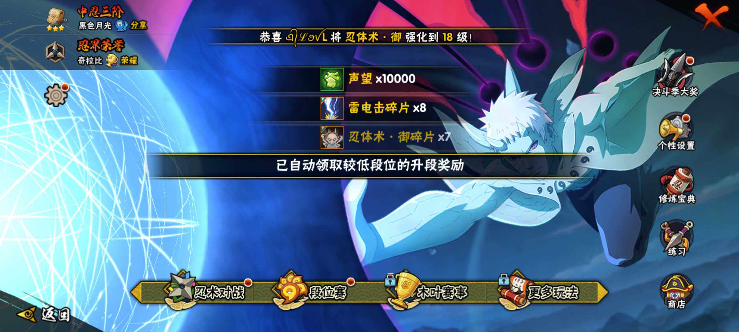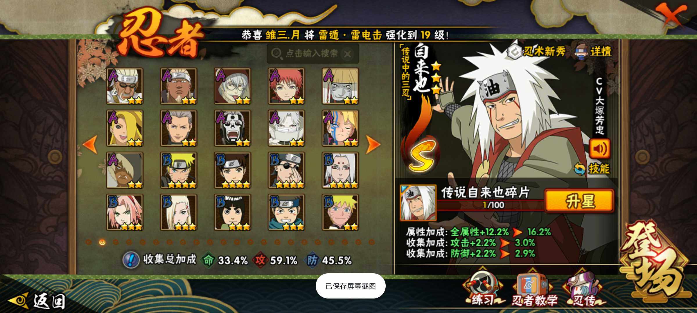【S级忍者】:宇智波鼬「秽土转生」(3星),宇智波斑「秽土转生·解」(3星),艾「忍界大战」(3星),宇智波鼬「须佐能乎」(3星),自来也「舞之豪杰」(3星),大蛇丸(3星),自来也「传说中的三忍」(3星),波风水门(3星),佩恩「天道」(3星),漩涡鸣人·宇智波佐助(3星)