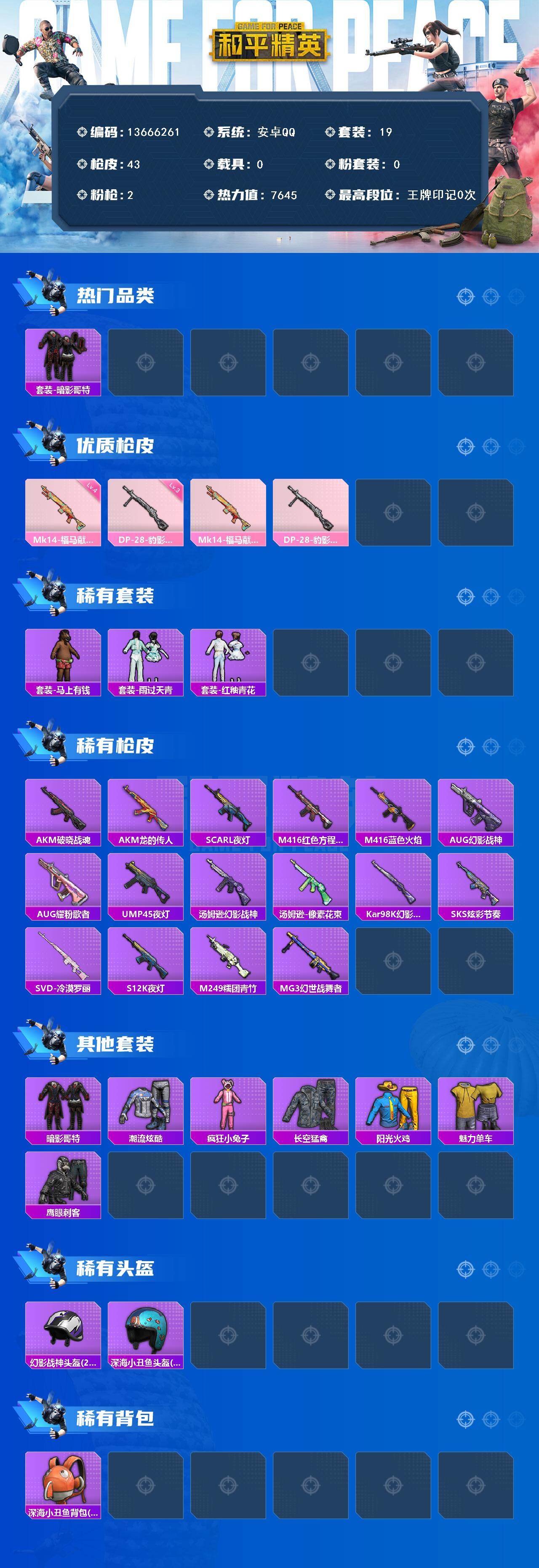 19套装/枪械2/装备26/战备28/热力值7645/四级Mk14-福马献瑞/三级DP-28-豹影疾电/套装-暗影哥特/Mk14-福马献瑞/DP-28-豹影疾电/套装-雪国风尚/套装-马上有钱/套装-雨过天青/套装-红釉青花/AKM-破晓战魂/AKM-龙的传人/SCAR-L-夜灯/M416-红色方程式/M416-蓝色火焰/AUG-幻影战神/AUG-耀粉歌者/UMP45-夜灯/汤姆逊-幻影战神/汤