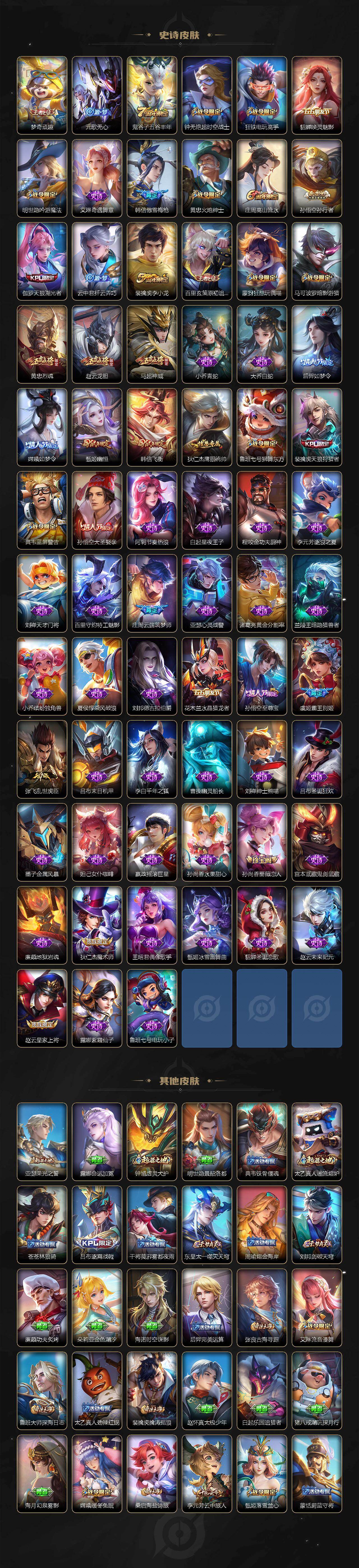 【传说皮肤】:后羿神树通天,桑启鸣野蒿,干将莫邪画中仙,李信山海炽霜斩,吕布怒海麟威,李白诗剑行,鲁班七号寅虎瑞焰,赵云淬星耀世,铠绛天战甲,镜炽阳神光,虞姬启明星使,关羽武圣,曜云鹰飞将,李信一念神魔,百里玄策白虎志,孙尚香末日机甲,宫本武藏地