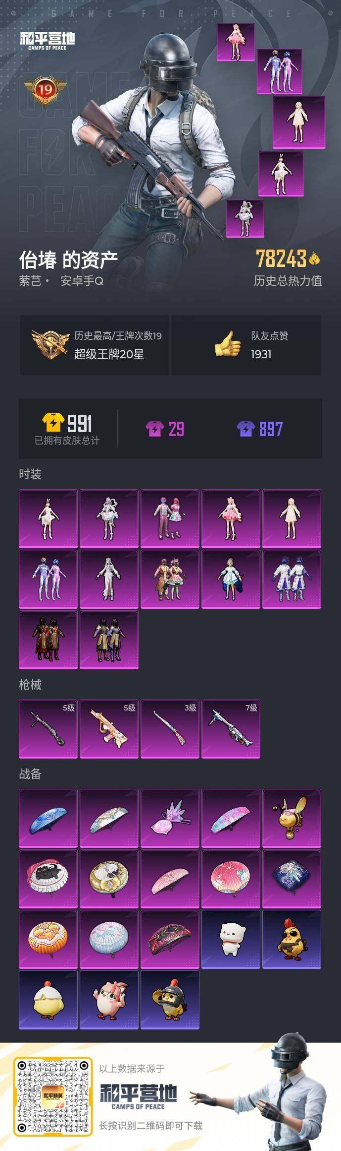 安卓 手Q-12粉装-4特效枪-0载具-2粉色飞行器-78243热力值-19王牌印记-209套装-256枪皮
