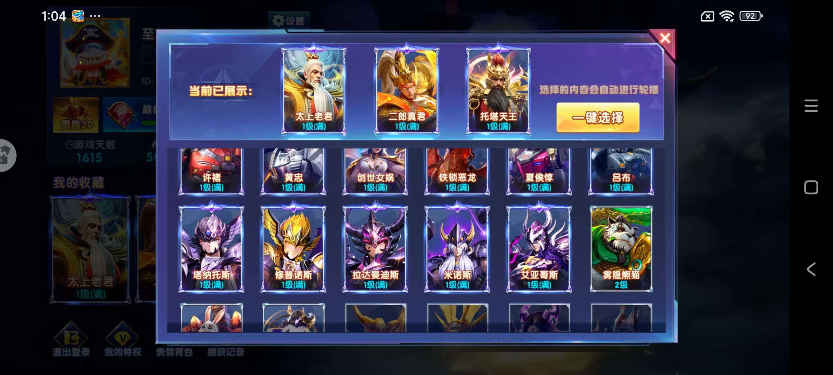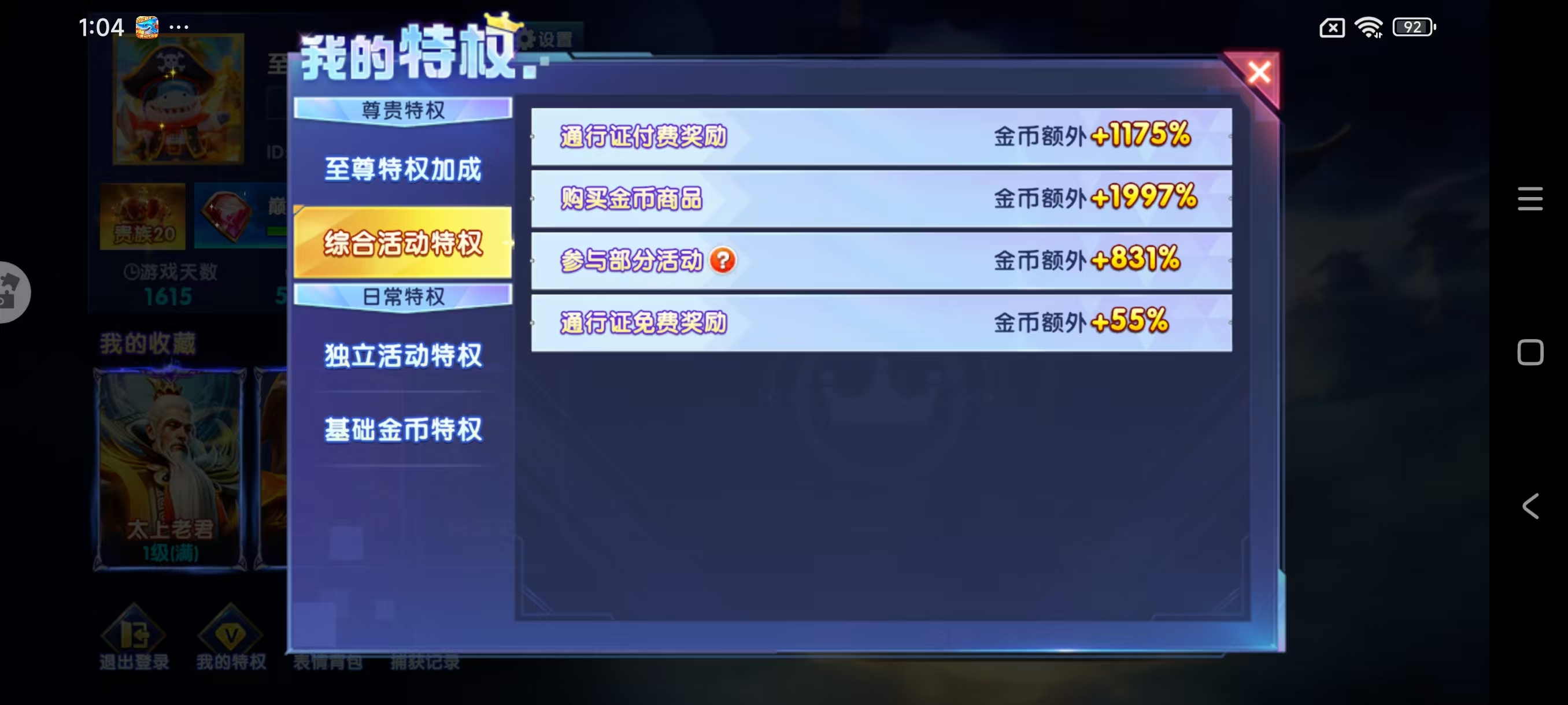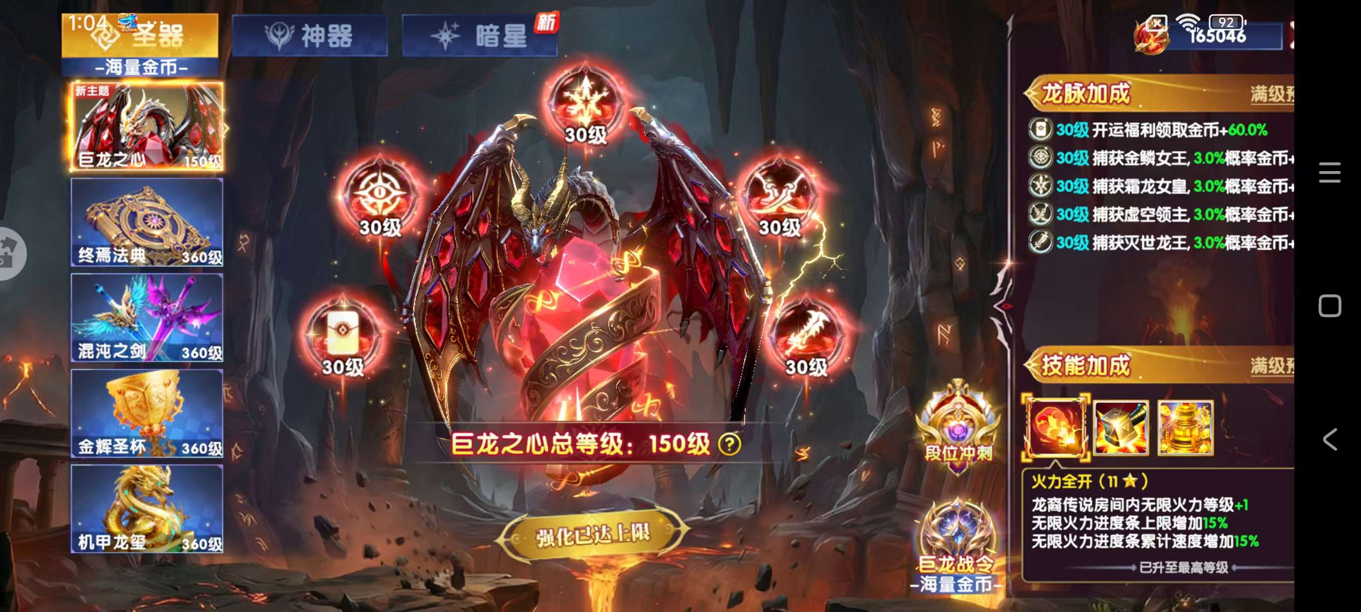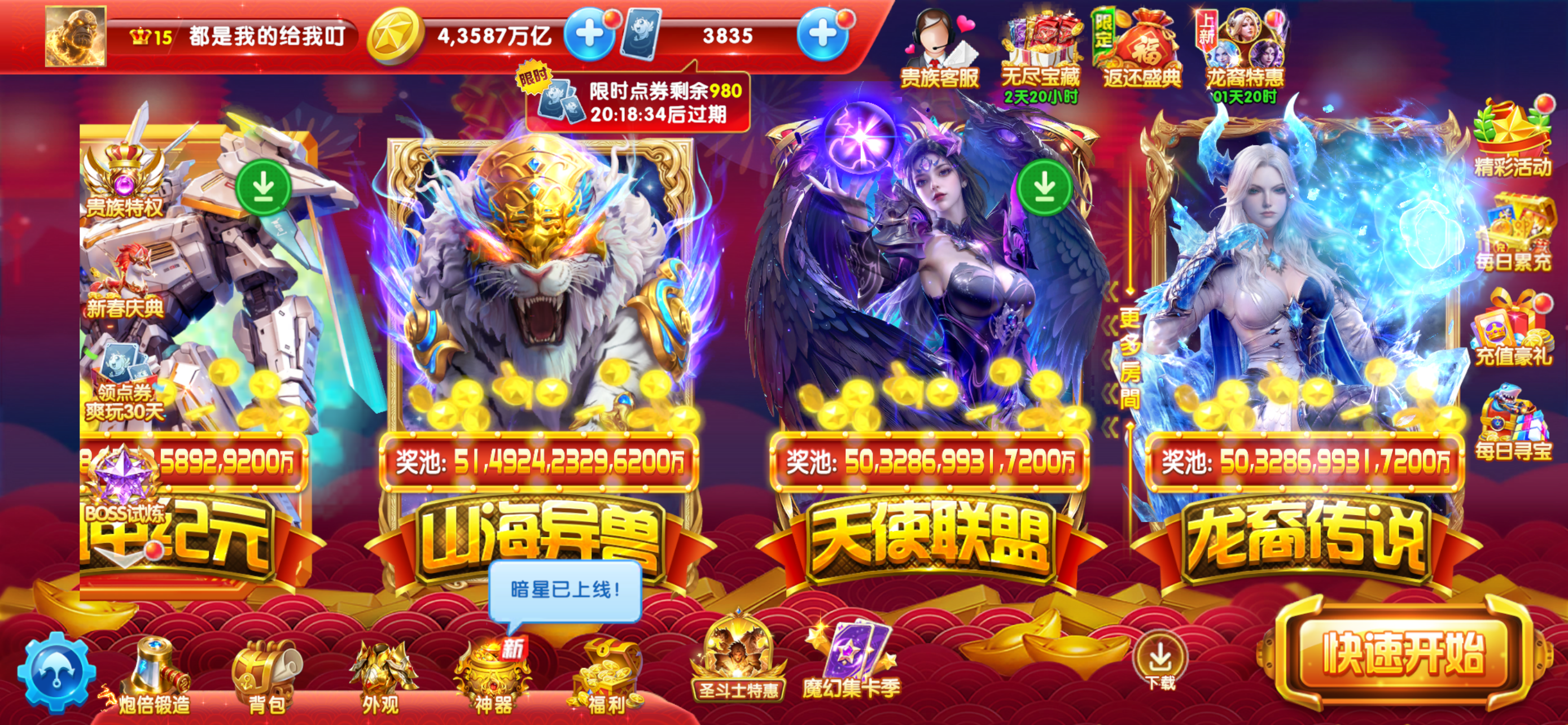 出华为渠道贵族20号,加成1977%,炉子5级,聚宝盆7级,天使技能,啥都有,神器以打满,13套装,