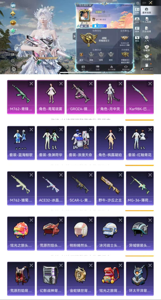 苹果Q区-2粉3满级特效 地铁已开 王者67皮至尊宝3传说【可二次 鸢尾珑雾 月中灵 浪漫天命 枫露凝珀 送王者67皮至尊宝3传说1星传说2银标】-15027热力值-40套装-58枪皮-荣耀皇冠II-游戏36级 【优质套装】: 鸢尾珑雾 月中灵 【特效枪等级】:M762-青锋波束(五级- M762-青锋波束)GROZA-镜光银凌(五级- GROZA-镜光银凌)Kar98K-巳巳