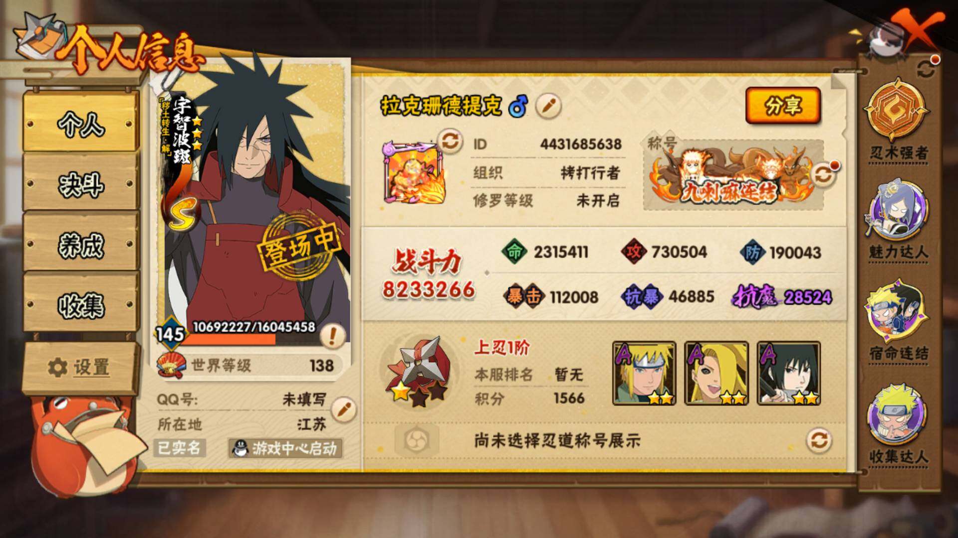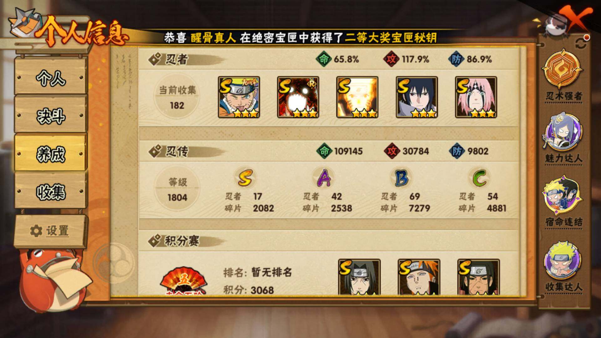 (可免费转苹果)v11,821w战力,17S级忍者数-42A级忍者数,有熊猫,