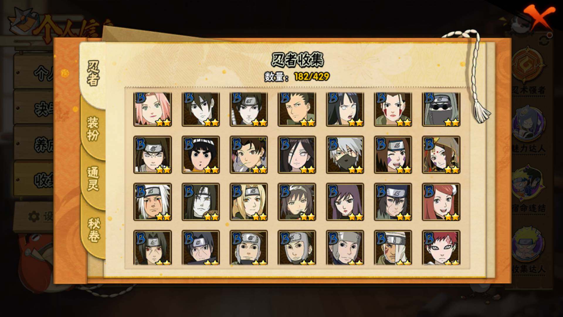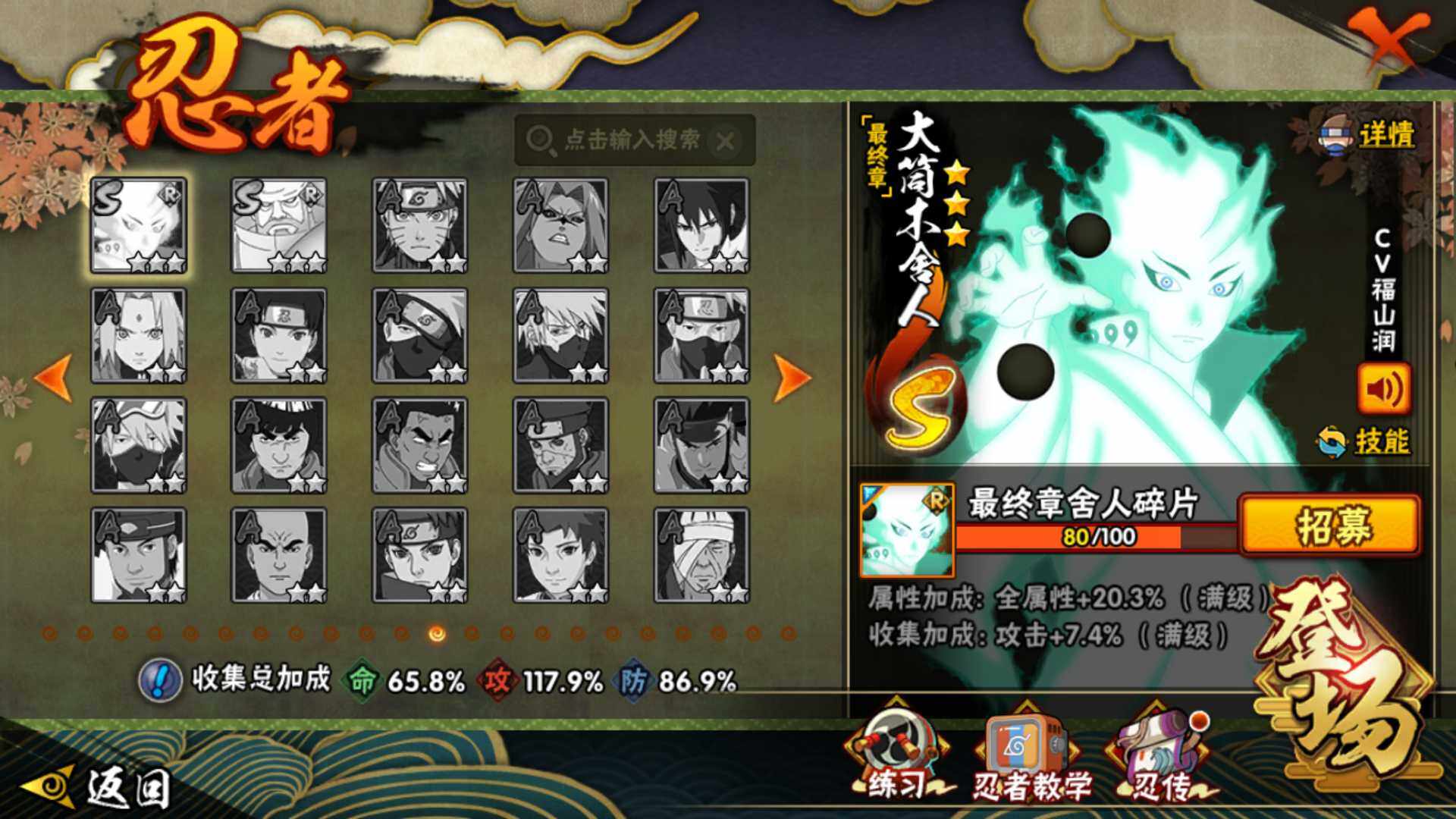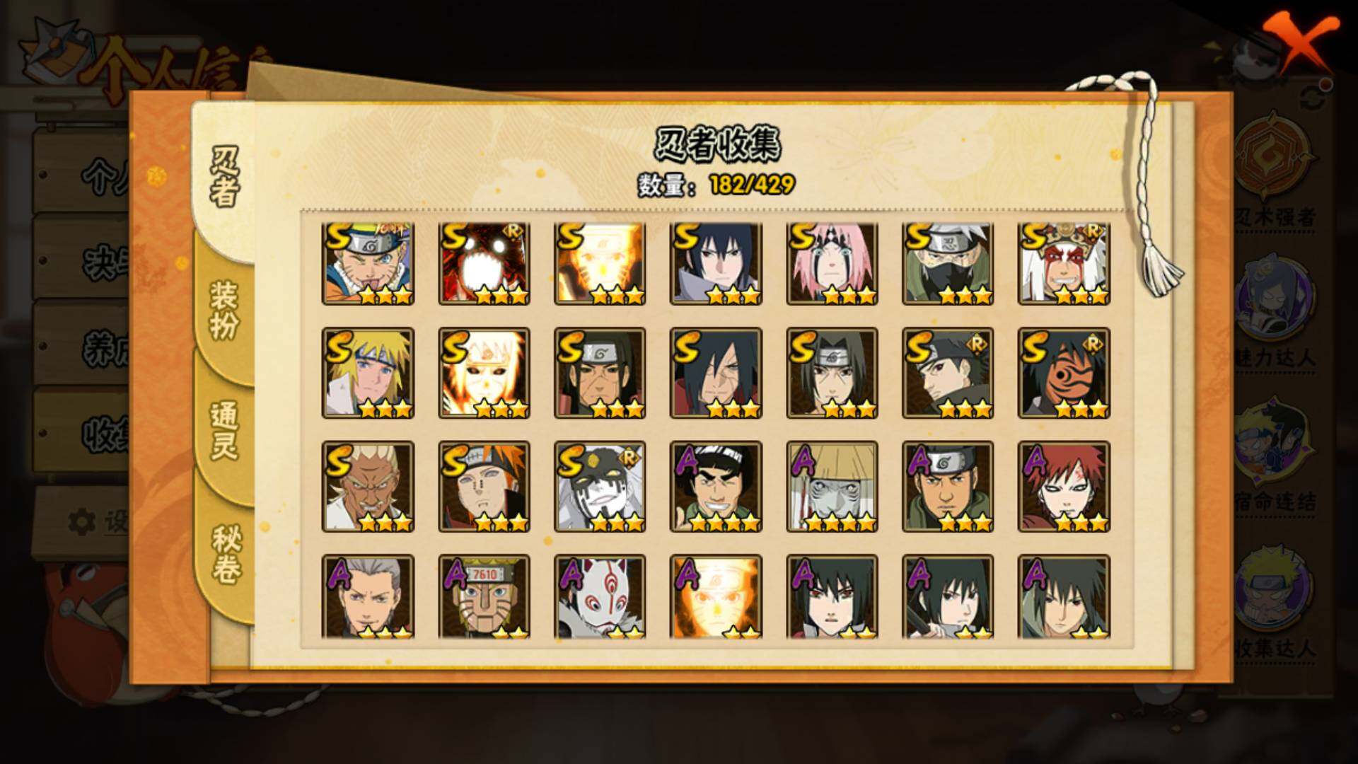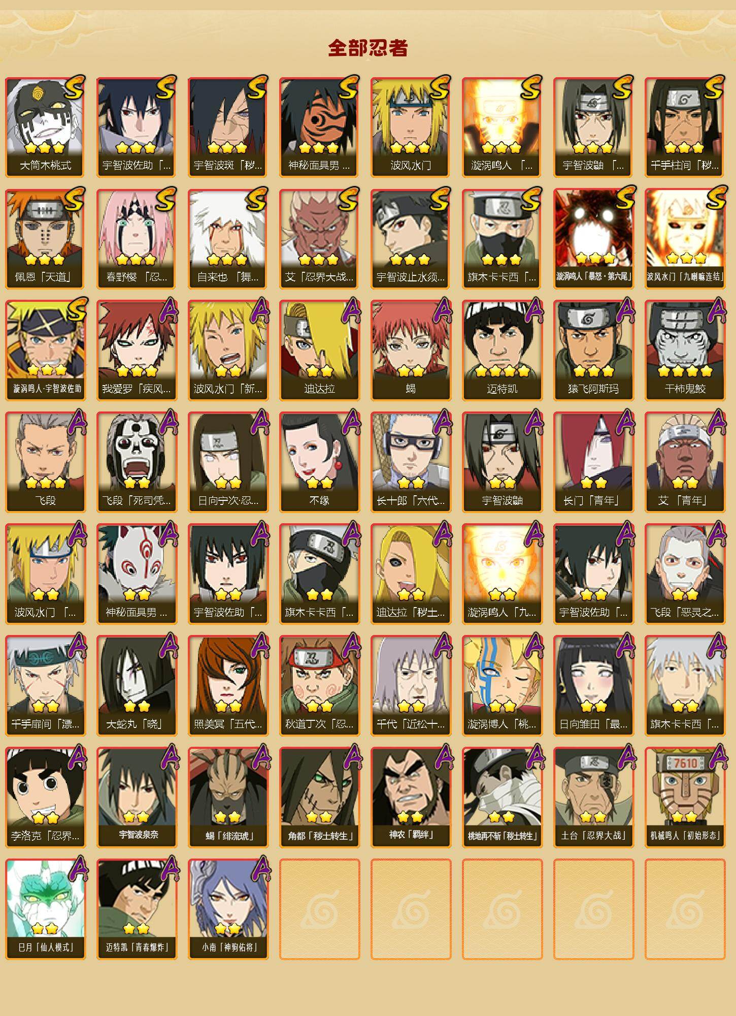 【S级忍者】:千手柱间「秽土转生」(3星),宇智波斑「秽土转生·解」(3星),春野樱「忍界大战」(3星),艾「忍界大战」(3星),宇智波鼬「须佐能乎」(3星),宇智波止水「须佐能乎」(3星),旗木卡卡西「须佐能乎」(3星