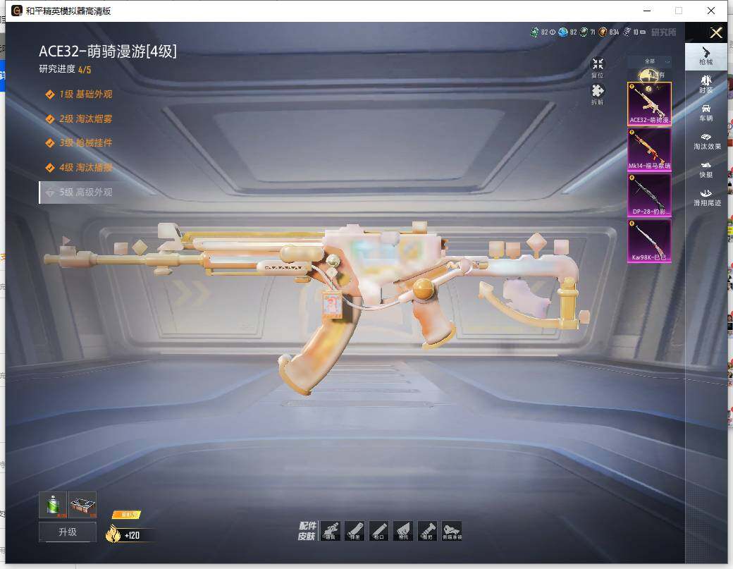 【粉色枪皮等级】:ACE32-萌骑漫游(四级),Kar98K-巳巳如意(五级),Mk14-福马献瑞(五级),DP-28-豹影疾电(五级)