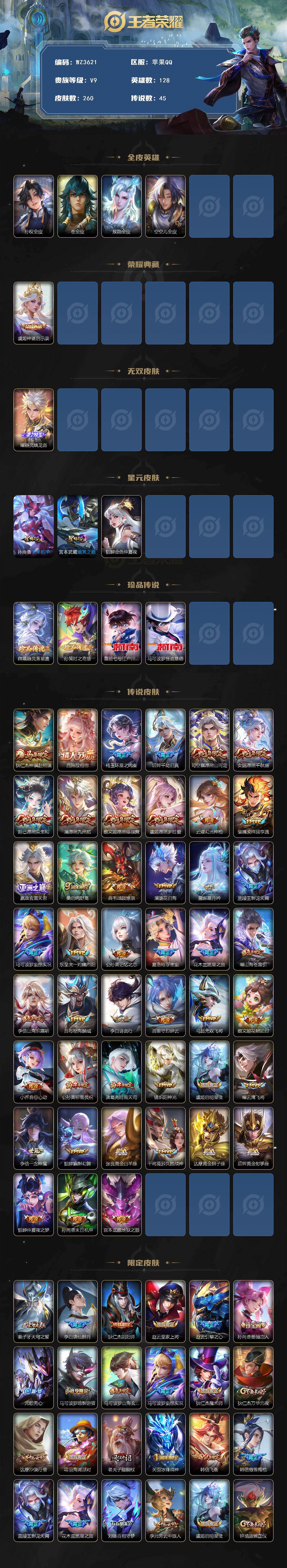 【秒换绑】苹果Q-V9-最强王者段位-128英雄-260皮肤-1典藏皮肤-1无双-4珍品传说-45传说-62史诗