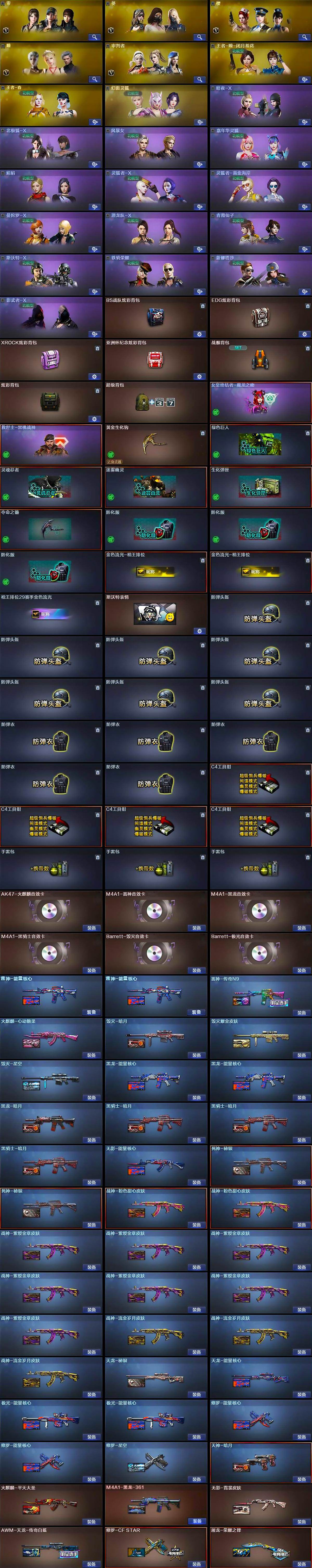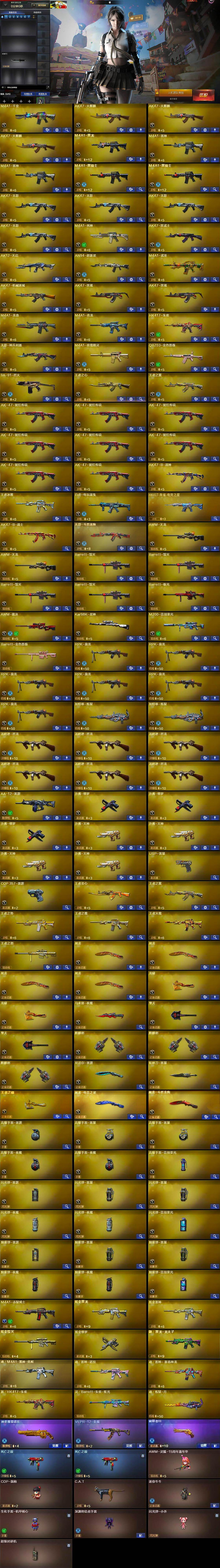 【热门武器】:QBZ03-金色蔷薇,HK417-朱雀,M4A1-青龙,M200-竞技荣光,死亡之眼*2,白虎-电玩蓝兔,王者炎心,Kar98K-星神,C.A.T,M4A1-黑骑士*2,汤姆逊-烈龙*6,RPK-盘龙*6,加特林-炼狱*2,降世魔童,USP-雷暴,沙鹰-修罗*3