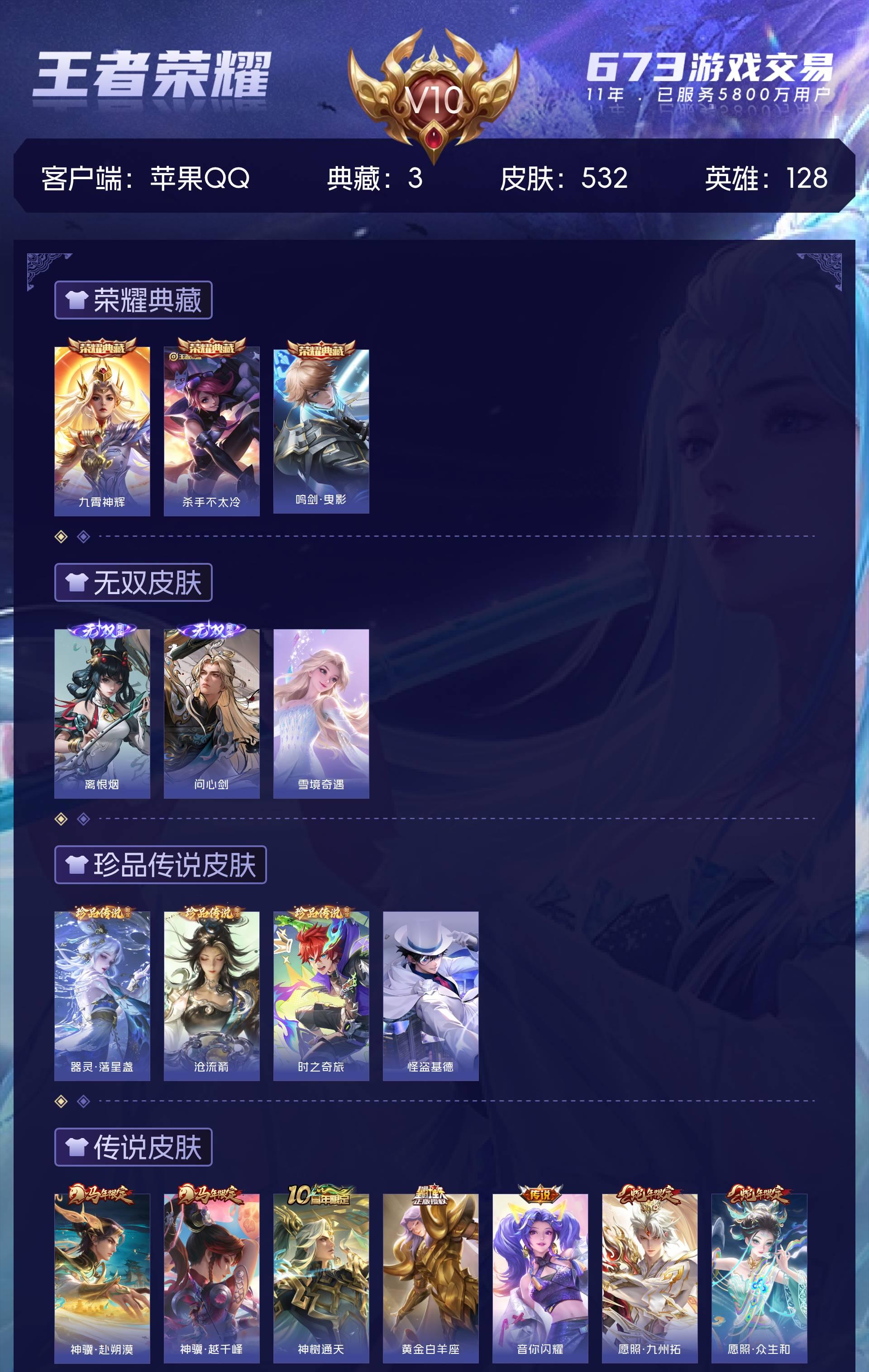 苹果QQ/无双王者/532皮肤/128英雄/3典藏/0珍品无双/3无双/4珍品传说/66传说/176