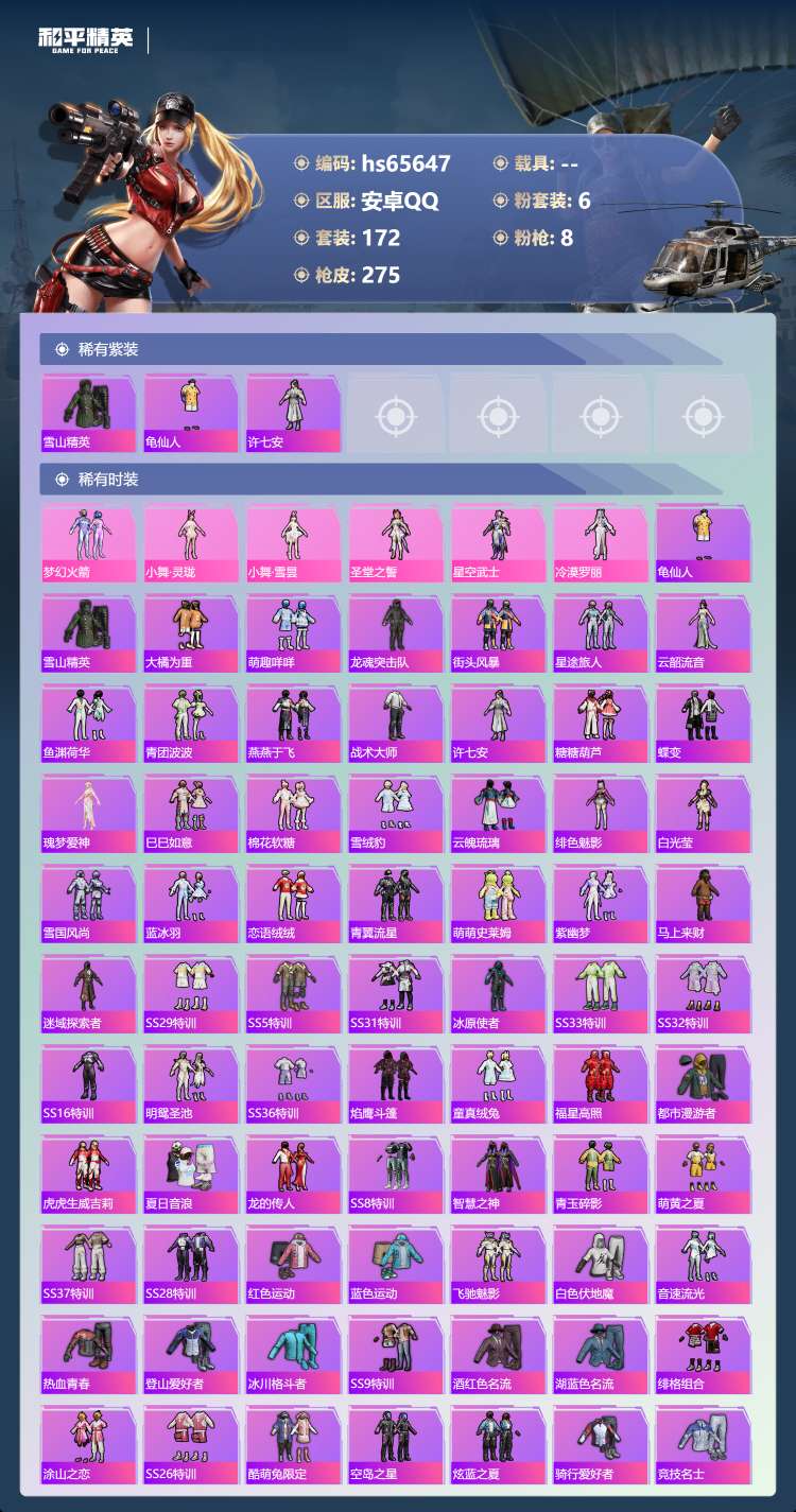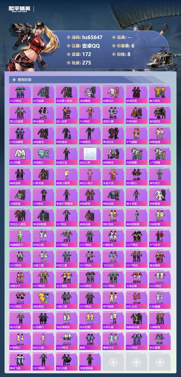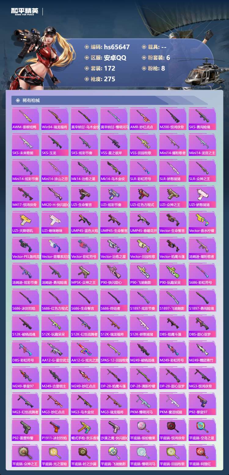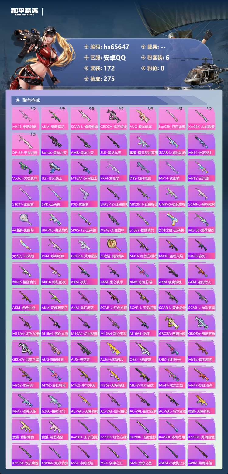 hs65647 安卓手Q-12王牌印记-6粉装-8特效枪-77893热力值-172套装-275枪皮-