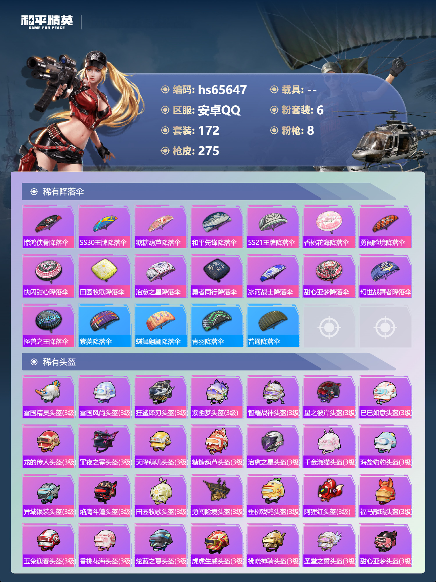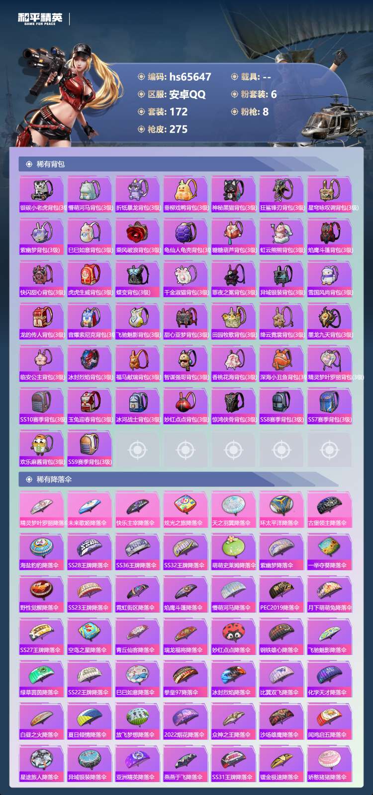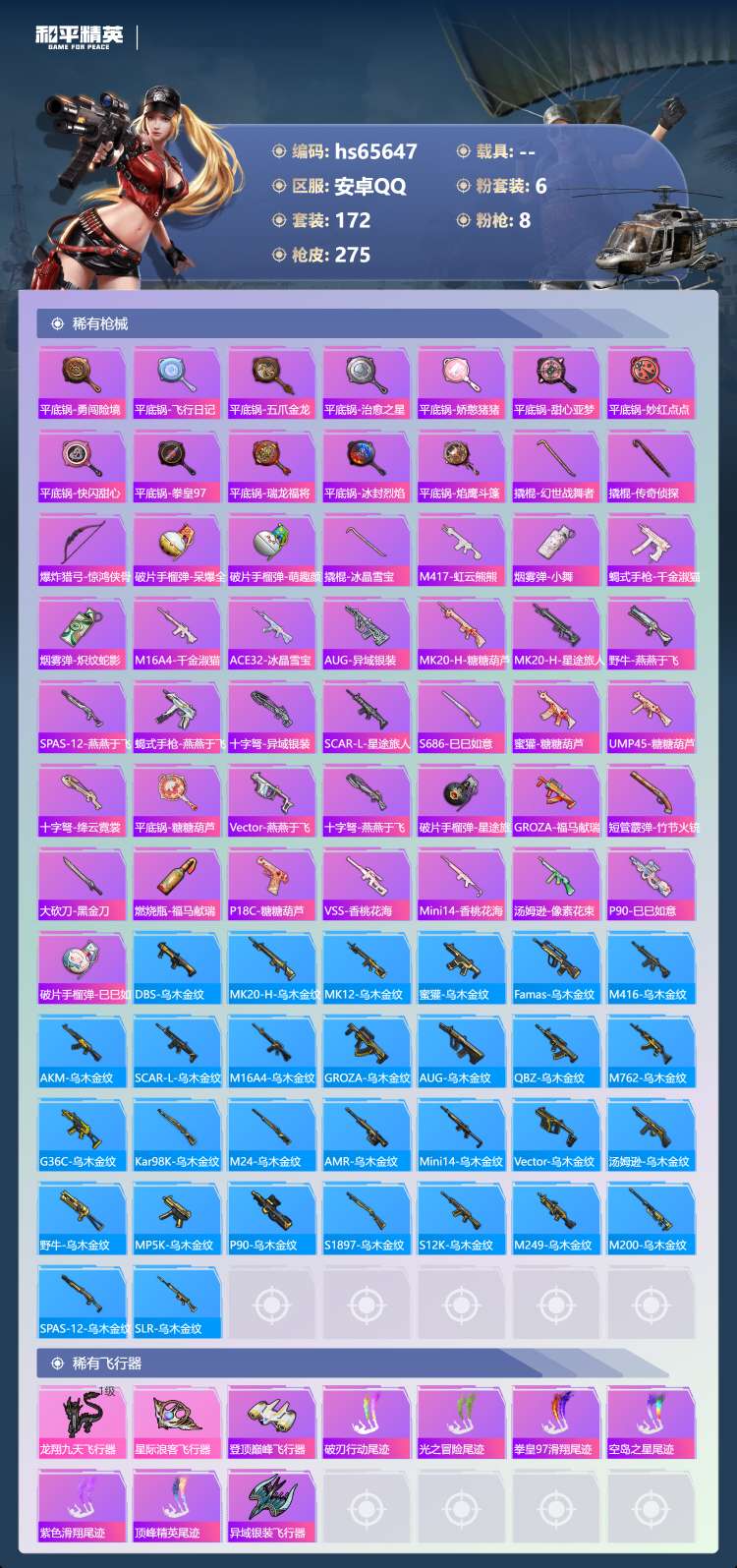 hs65647 安卓手Q-12王牌印记-6粉装-8特效枪-77893热力值-172套装-275枪皮-