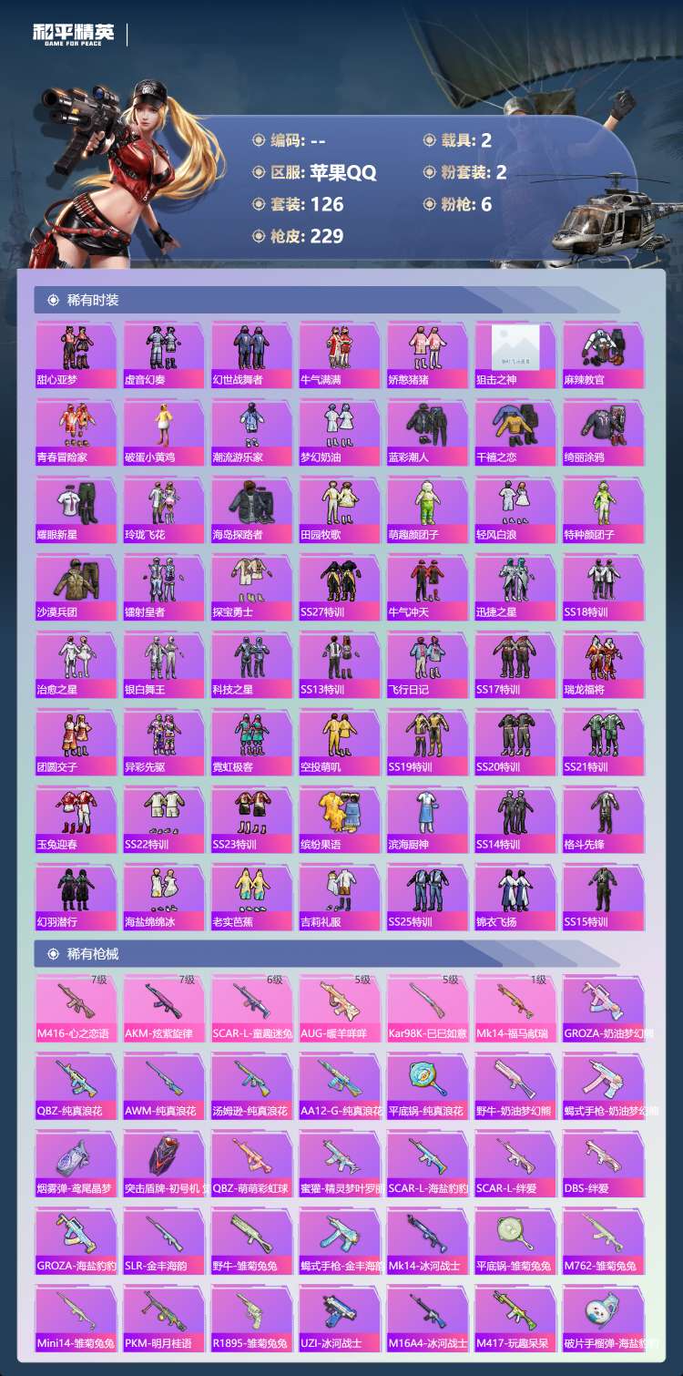 hs66209 苹果手Q-14王牌印记-2粉装-6特效枪-2载具-69619热力值-126套装-22