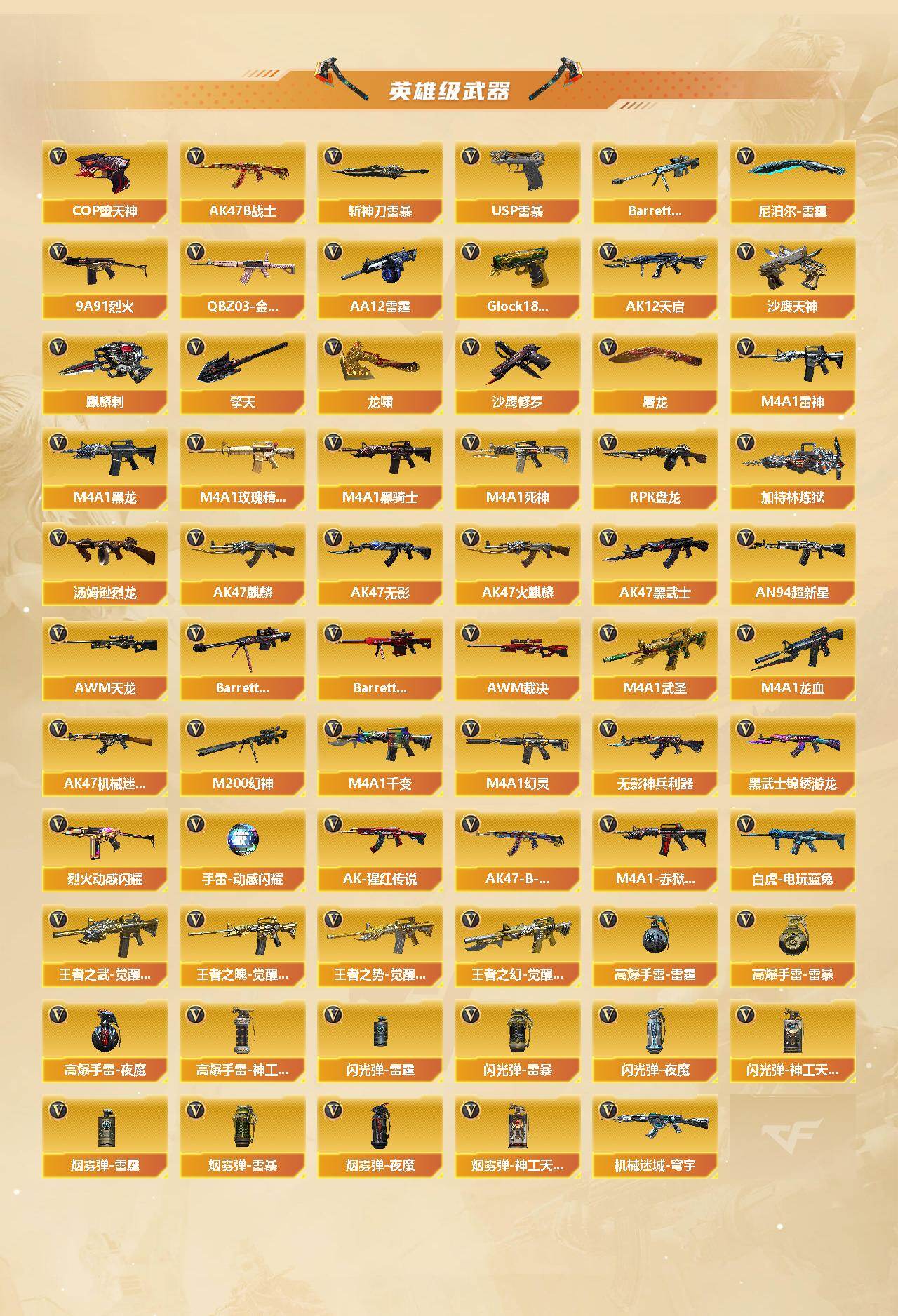 【热门武器】:QBZ03-金色蔷薇,HK417-朱雀,M200-幻神,死亡之眼*2,白虎-电玩蓝兔,炼狱-迷你小钢,M4A1-黑骑士*2,汤姆逊-烈龙*8,RPK-盘龙*6,加特林-炼狱*2,斯泰尔-蝴蝶,USP-雷暴,COP-堕天神*2,沙鹰-修罗*5
