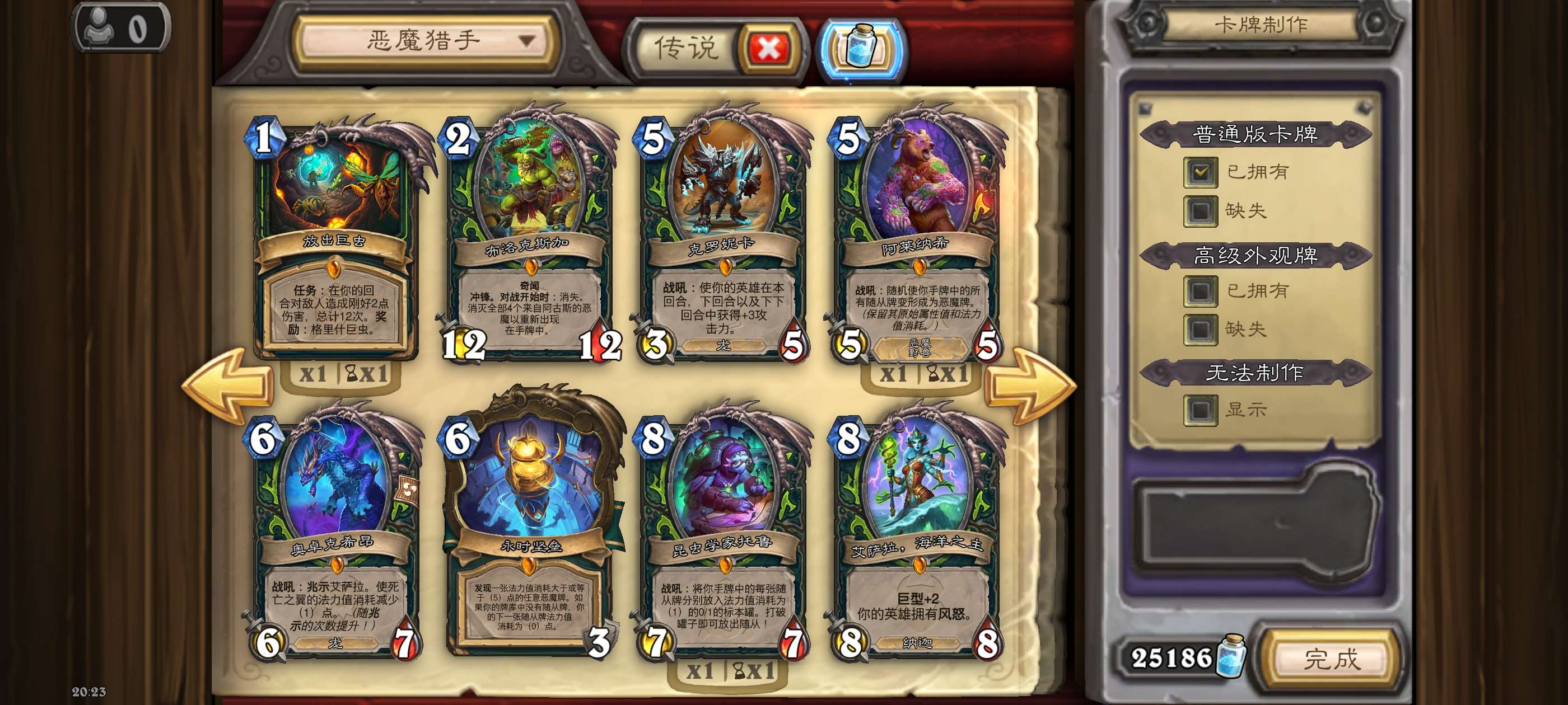 25186粉尘、313张传说卡,10张钻石橙卡49张异画卡含11张异画传说,2个神话皮肤:炎魔之王拉格纳罗斯、邪火拉格纳罗斯。