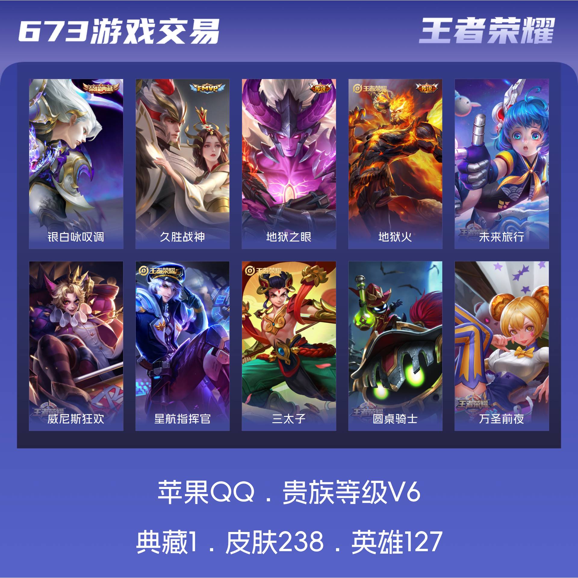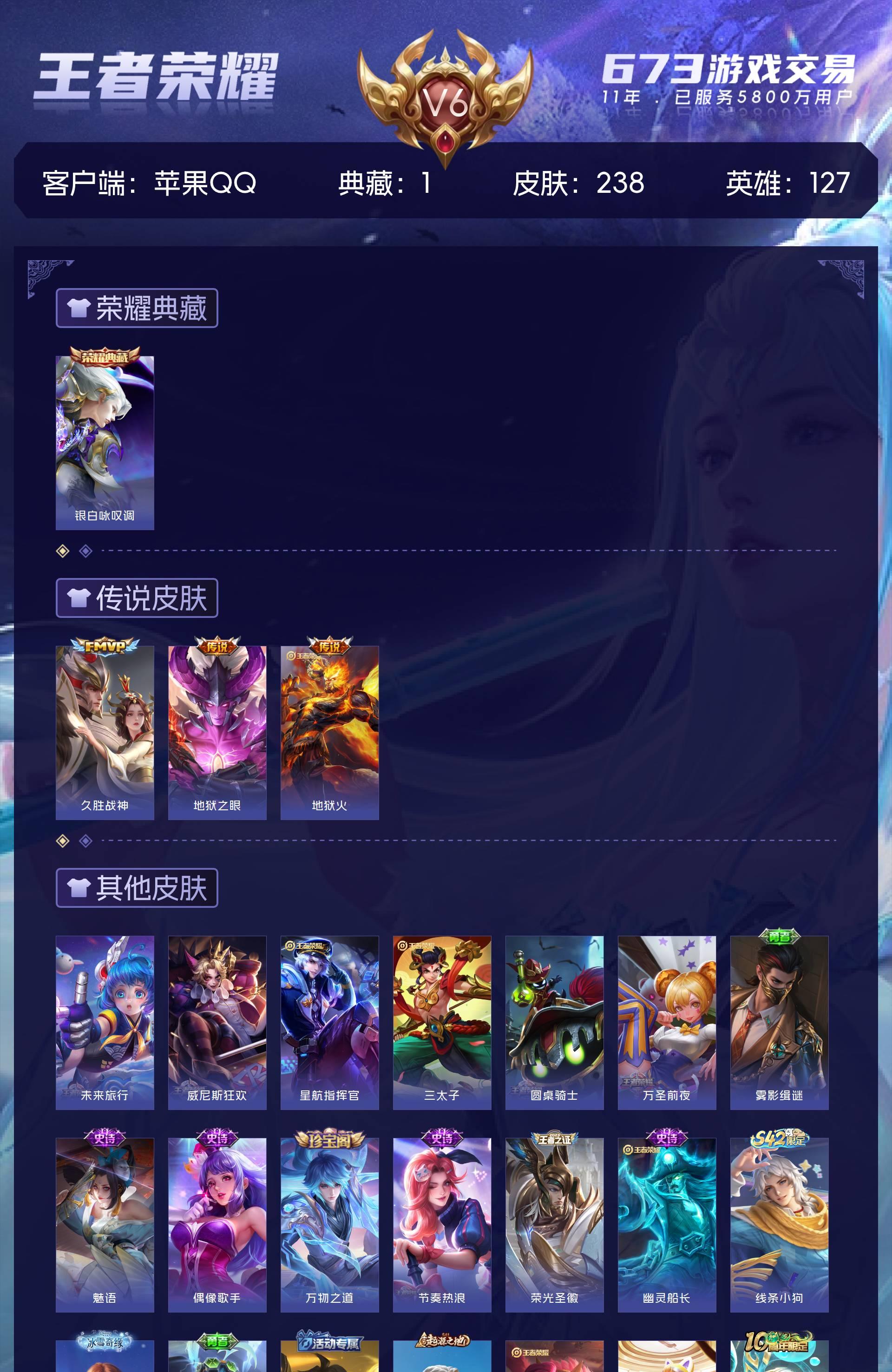 V6 皮肤238 英雄127 绝世王者 荣耀典藏1 传说3