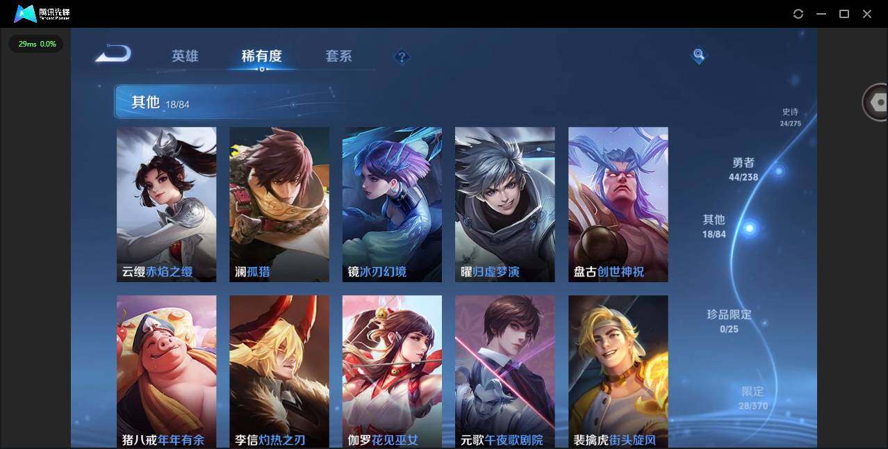贵族等级: V4 英雄数: 111 皮肤数: 92 星传说: 幽冥之眼,幽冥火 传说皮: 久胜战神,地狱之眼,澜逐花归海,典韦战鼓燎原,神树通天 限定皮: 至尊宝,五谷丰年,鸣野蒿,逐霄战戟