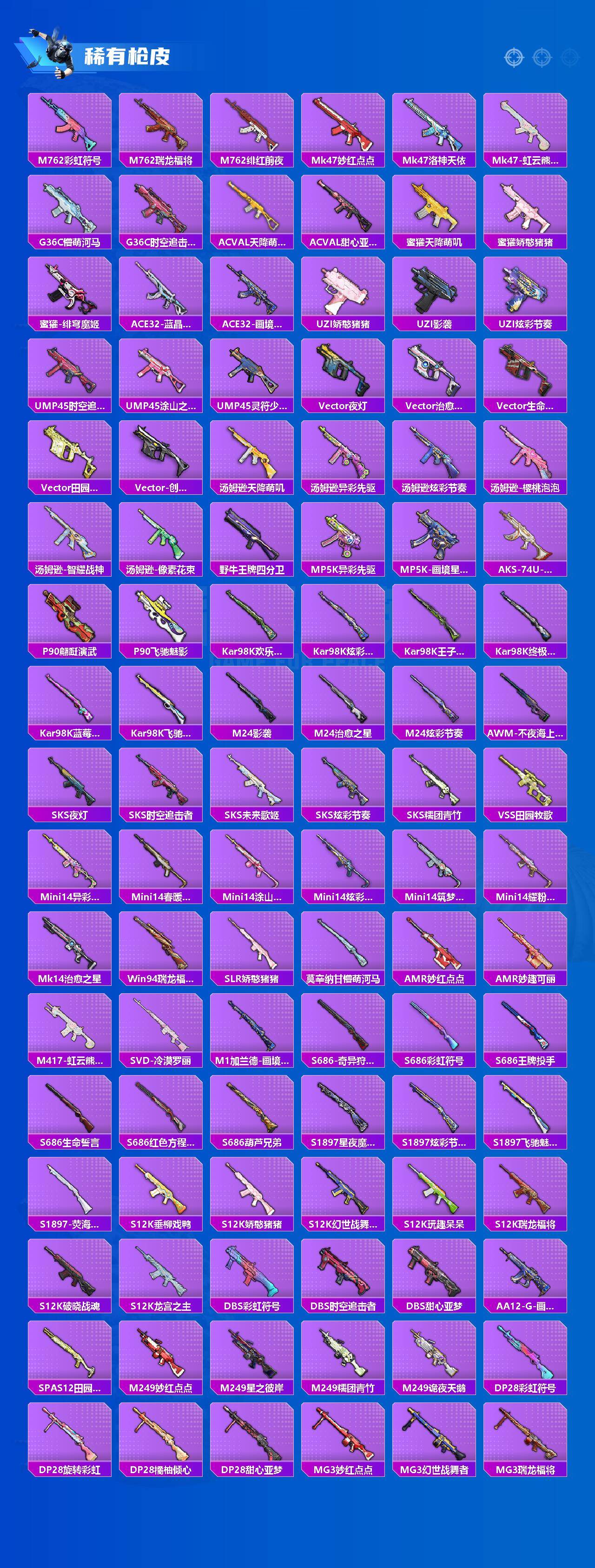 【粉色枪皮等级】:AUG-暖羊咩咩(五级),UMP45-萌骑冒险(四级),AKS-74U-森灵之息(五级),Kar98K-巳巳如意(五级),Mk14-福