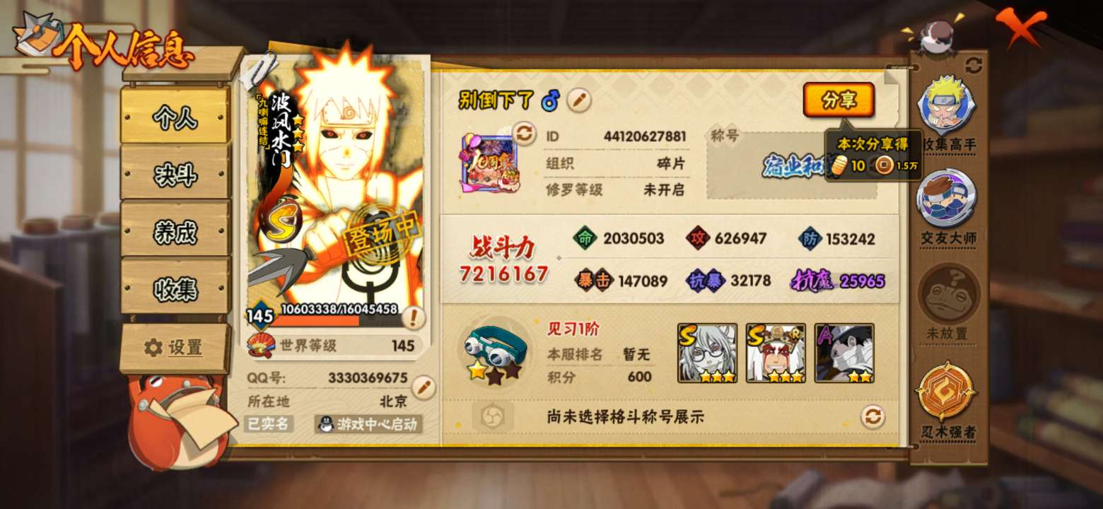 7s准8s,720w战力,10000金币,有熊猫,金水,老三代,仙人兜,五影斑,百豪纲57片,有二次