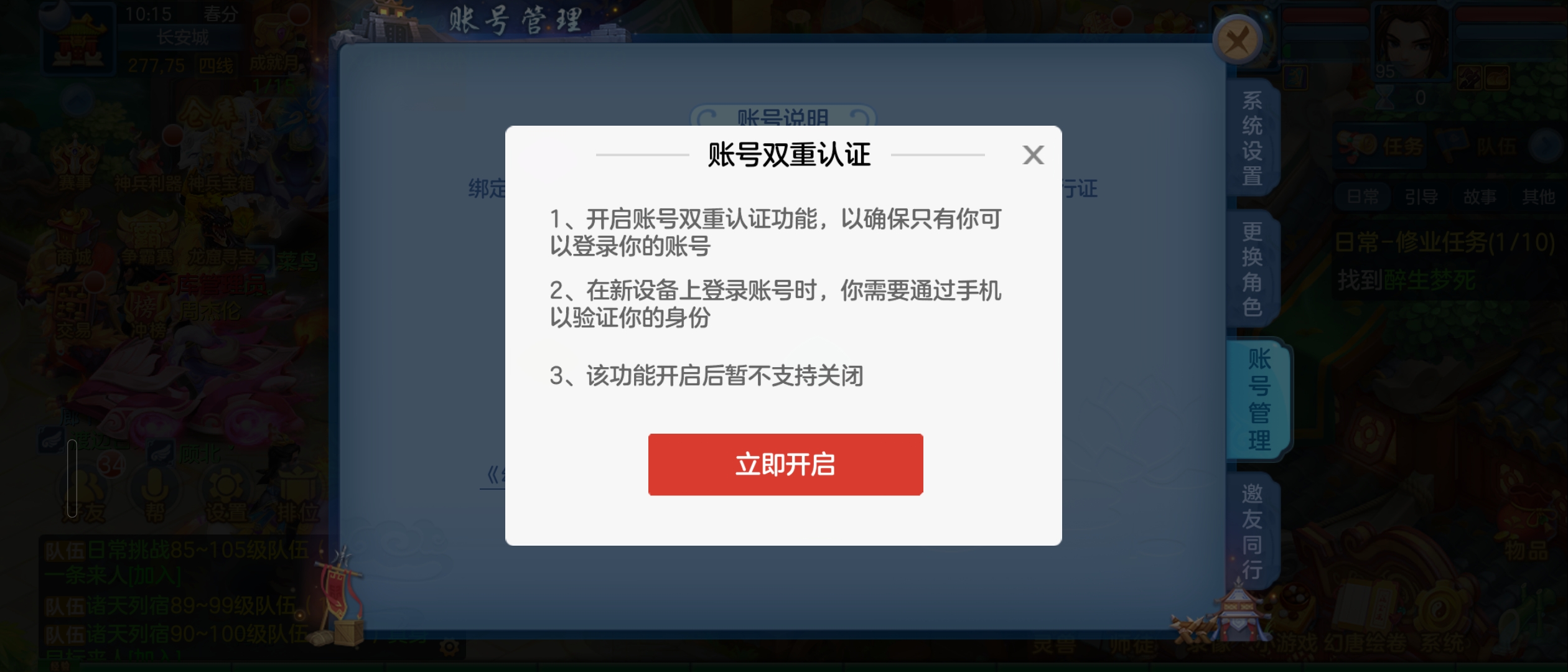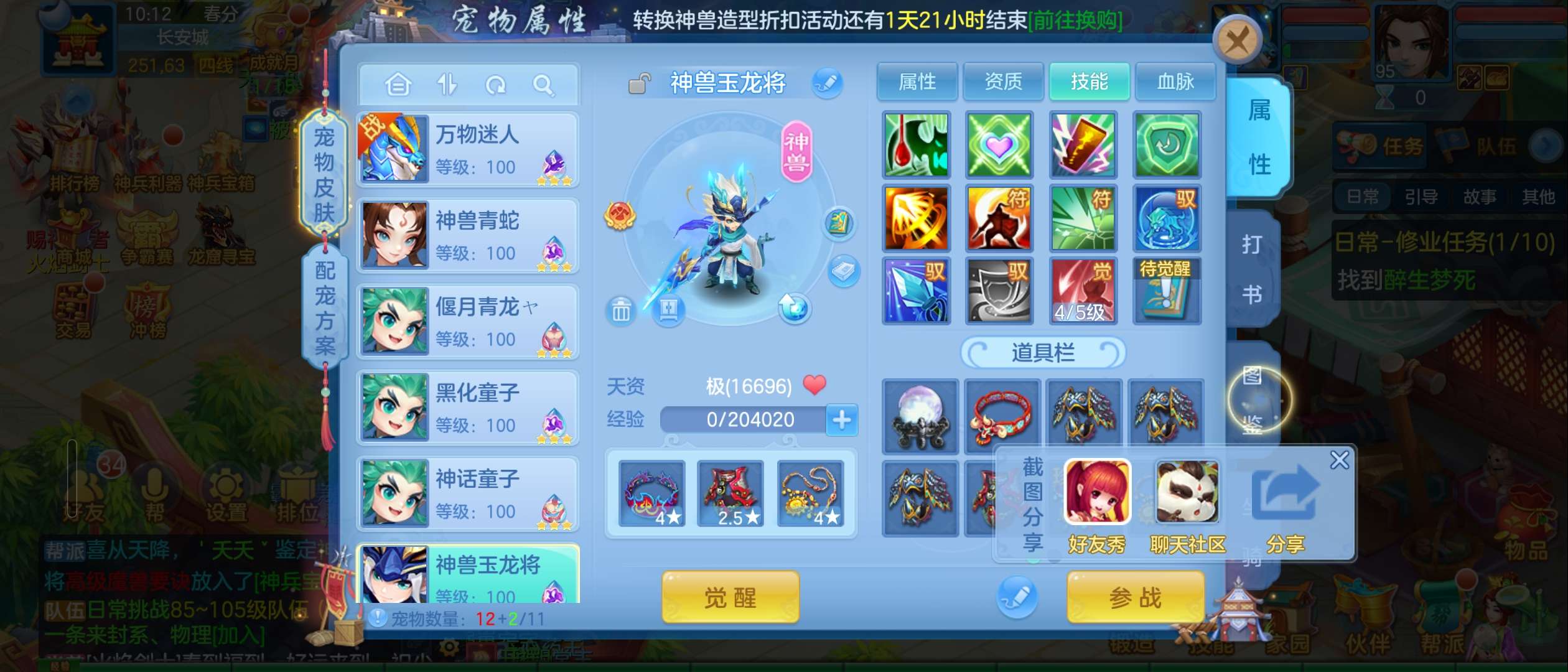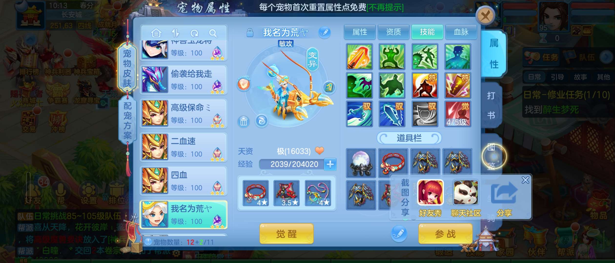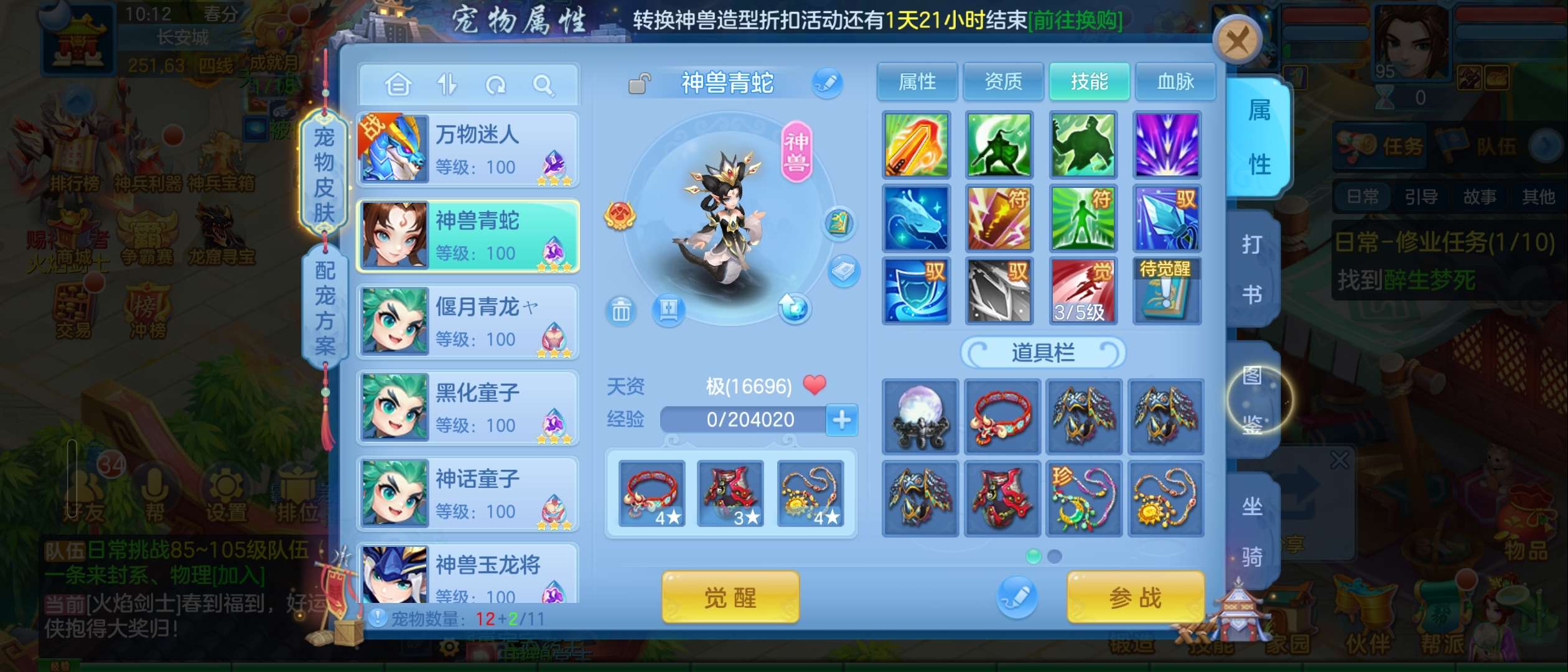 幻唐同行区,1仙2神,还有个神兽内丹,无双重,十几个皮肤6,95级,退游不玩送qq