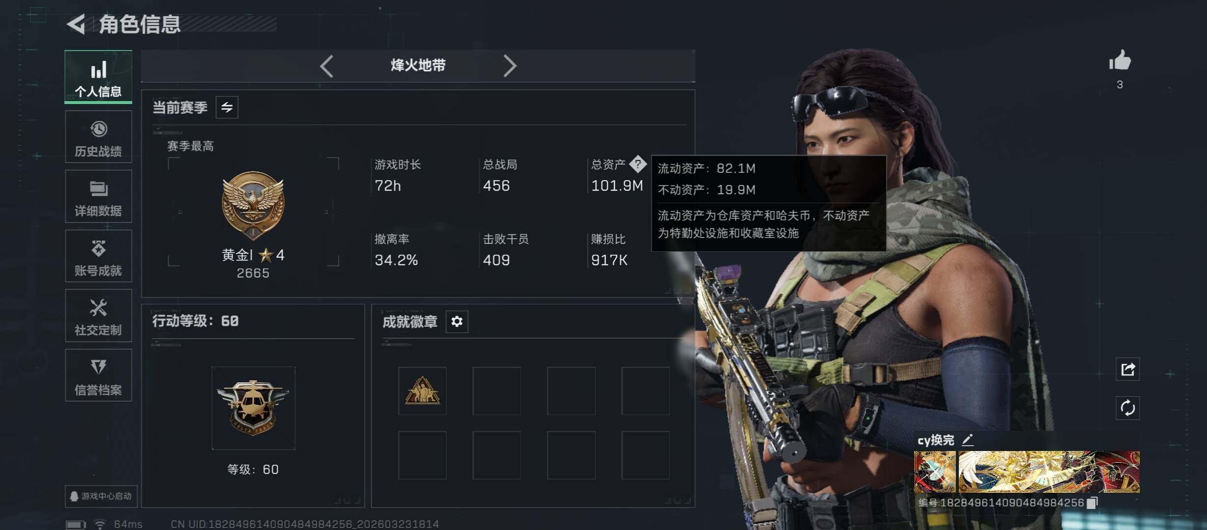 【中额资产101M+单刀皮-暗星.性价比高强烈推荐】【Q区三端互通】【无二次协助处理】YXz9618-特勤处:仓库6级/靶场6级/训练中心7级101m总资产-55w哈夫币-60烽火等级-黄金-8战场等级-列兵