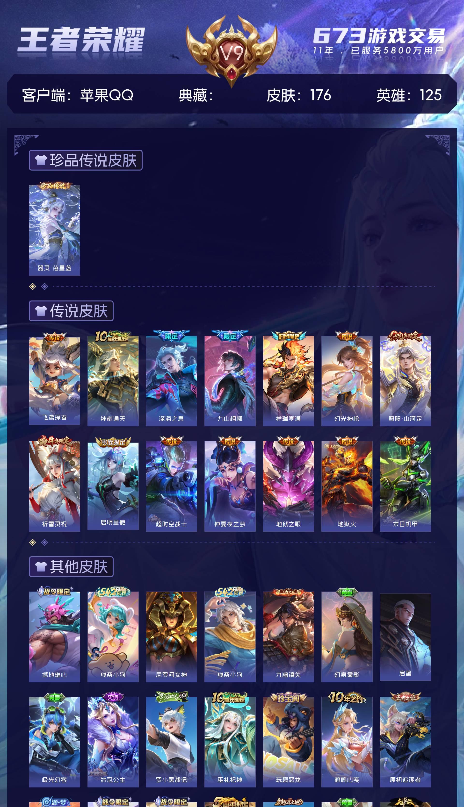 V9 皮肤176 英雄125 绝世王者 珍品传说1 星传说1 传说14
