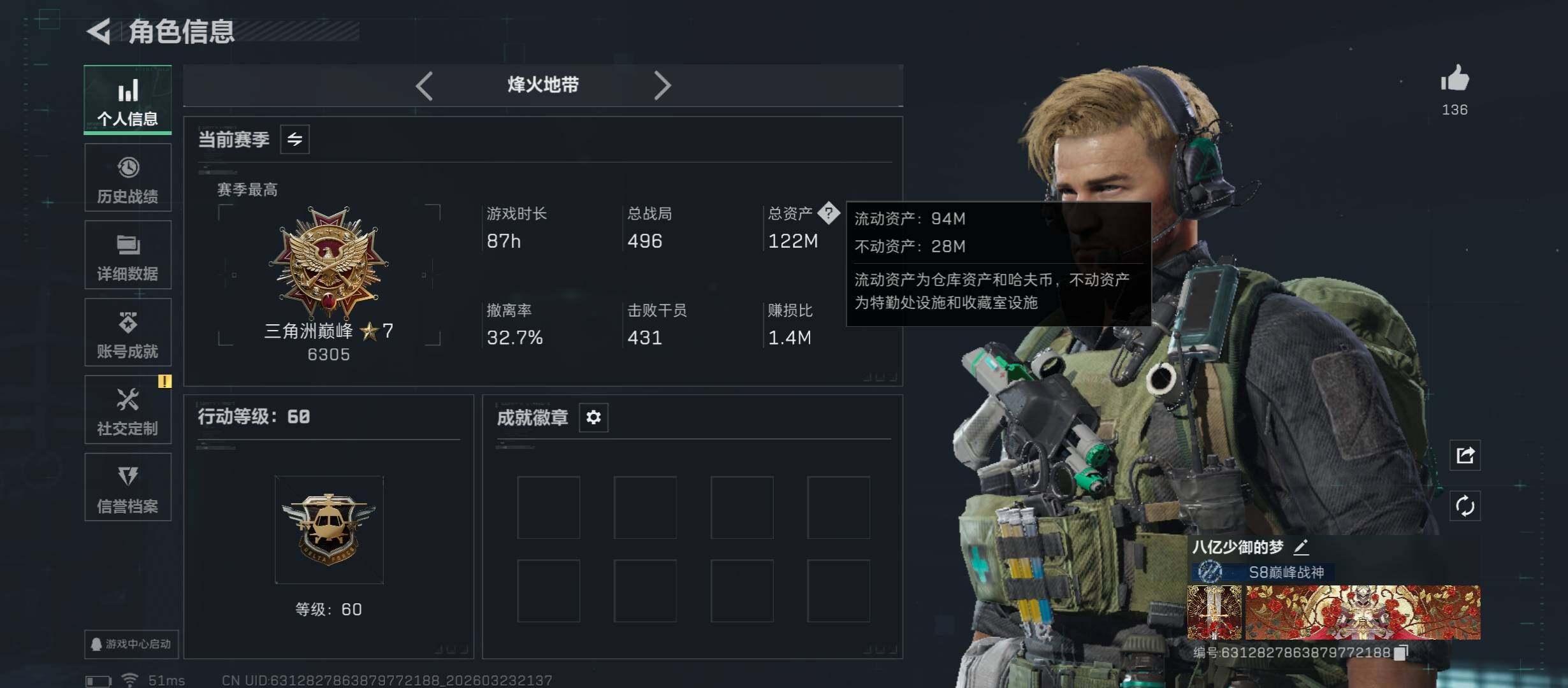【中额资产122M+三刀皮-信条+怜悯+处刑者1级】【Q区三端互通】【无二次协助处理】YXz9649-特勤处:仓库8级/靶场7级/训练中心7级122m总资产-3423w哈夫币-60烽火等级-三角洲巅峰-3战场等级-无军衔