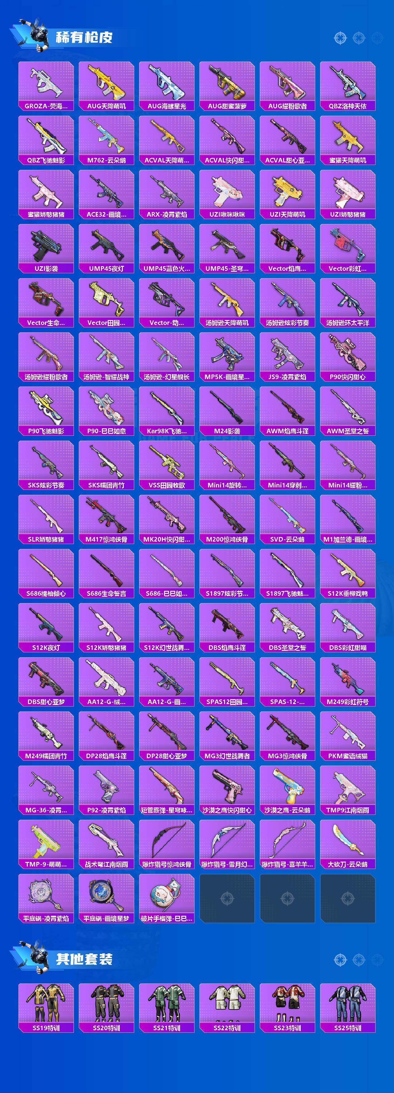 【粉色枪皮等级】:AKM-绿萝繁花(五级),ACE32-萌骑漫游(五级),AKS-74U-森灵之息(五级),Kar98K-巳巳如意(一级),Mk14-