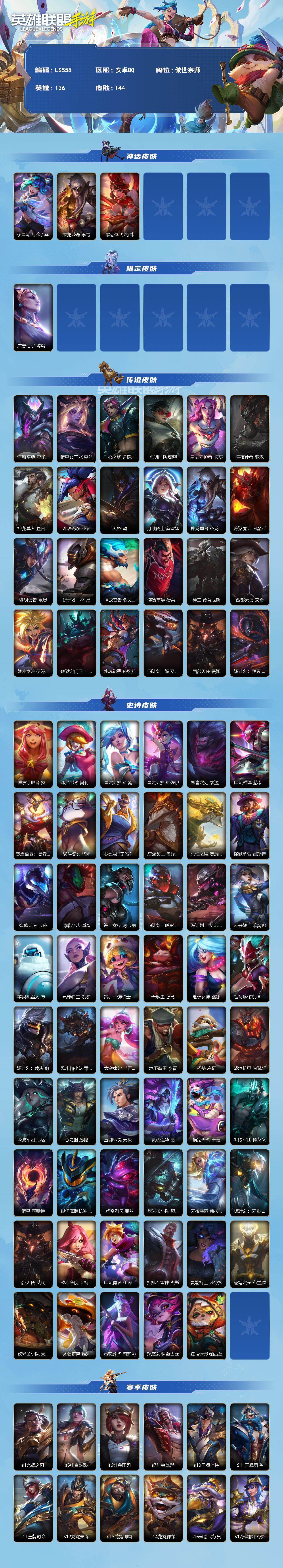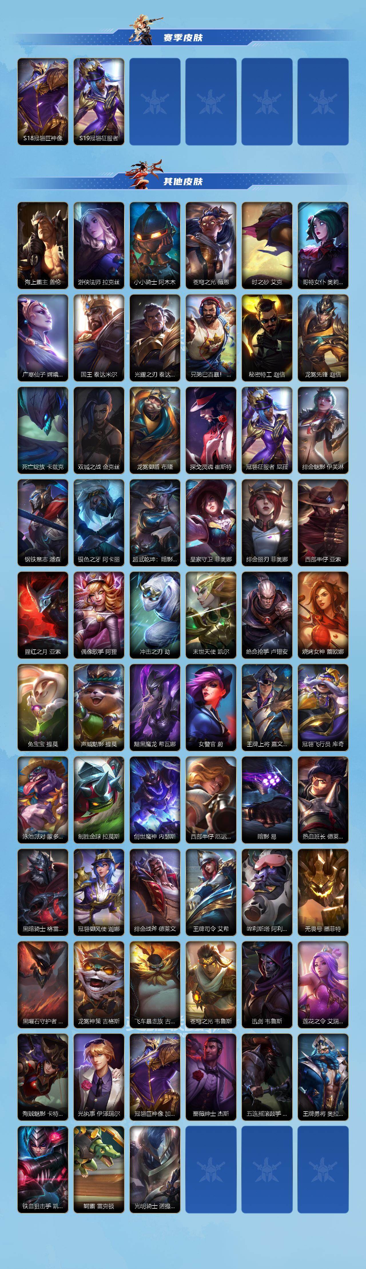 【传说皮肤】:海魔至尊 亚托克斯,暗星女王 拉克丝,心之钢 凯隐,光明哨兵 薇恩,星之守护者 卡莎,黑夜使者 亚索,神龙尊者 昼日真龙 亚索,斗魂无双 亚索,天煞 劫,月蚀骑士 蕾欧娜,神龙尊者 圣龙 李青,炼狱魔犬 内瑟斯,黎明使者 永恩,源计划:林 易,神龙尊者 驭风啸龙 易,灌篮高手 德莱厄斯,神王 德莱厄斯,西部天使 艾希,战斗学院 伊泽瑞尔,地狱之门卫士 加里奥