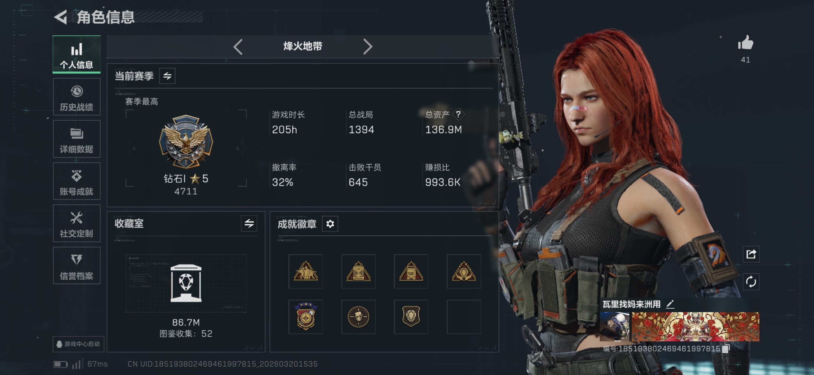 {特价出售}《赛季通行证》《 赛季九格4月16号到期》等级:60总资产:136.9M 纯币11135K 隐藏挂饰刀皮:近战-信条/近战-处刑者/近战-暗星 特勤处:仓库7,训练6,靶场6 部门22222红狼-电锯惊魂,露娜-金牌射手,乌鲁鲁-荒原猎手,蛊-不羁人生