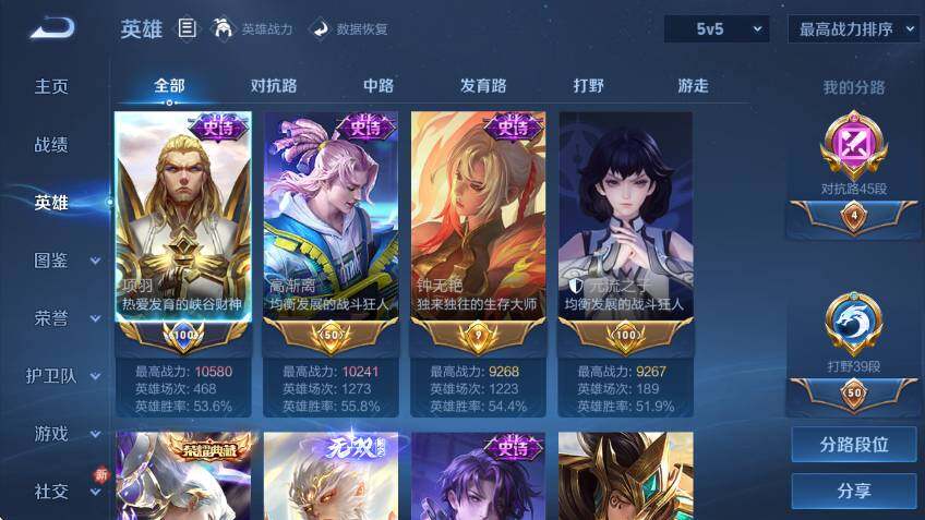 贵族8-对抗路45段-打野39段-中路33段-小国项羽-金标高渐离、钟无艳、元流