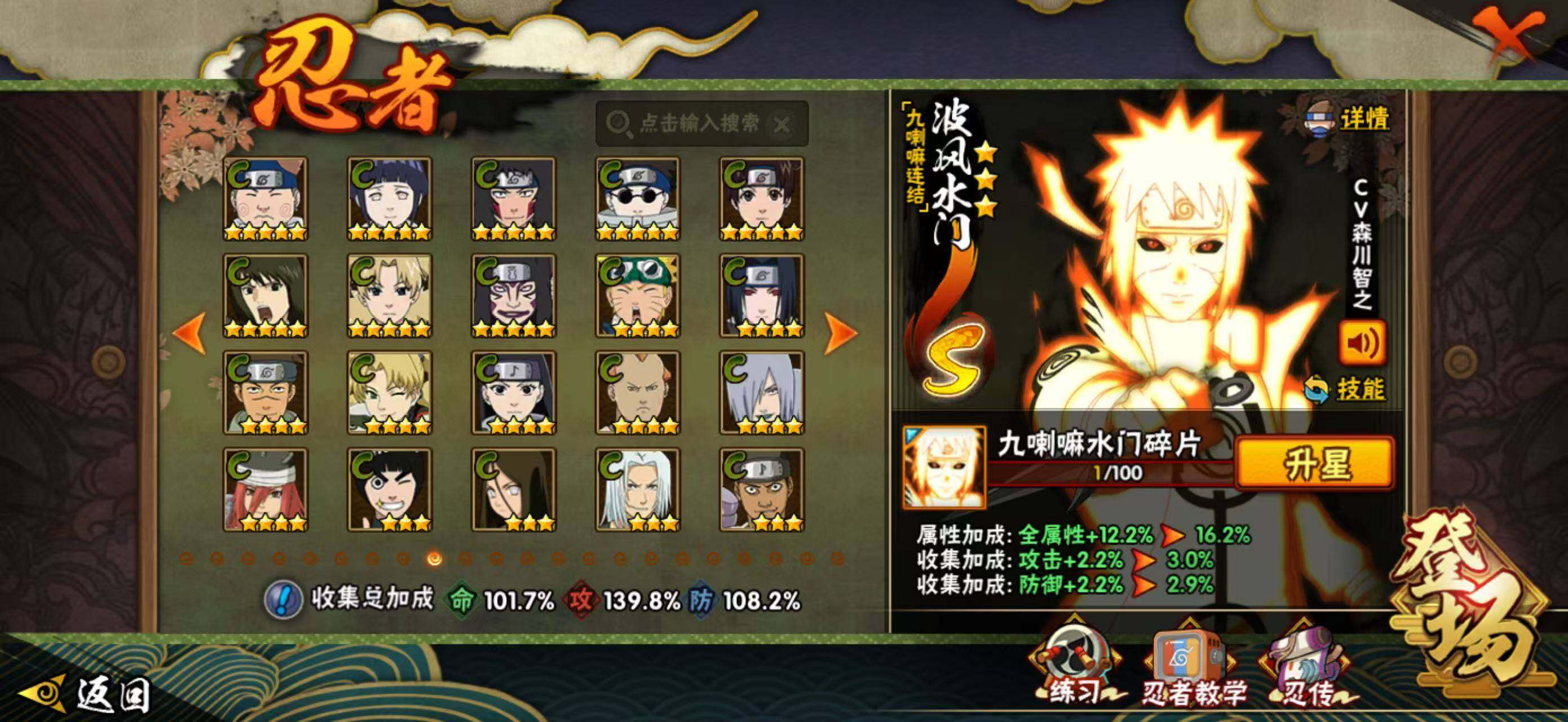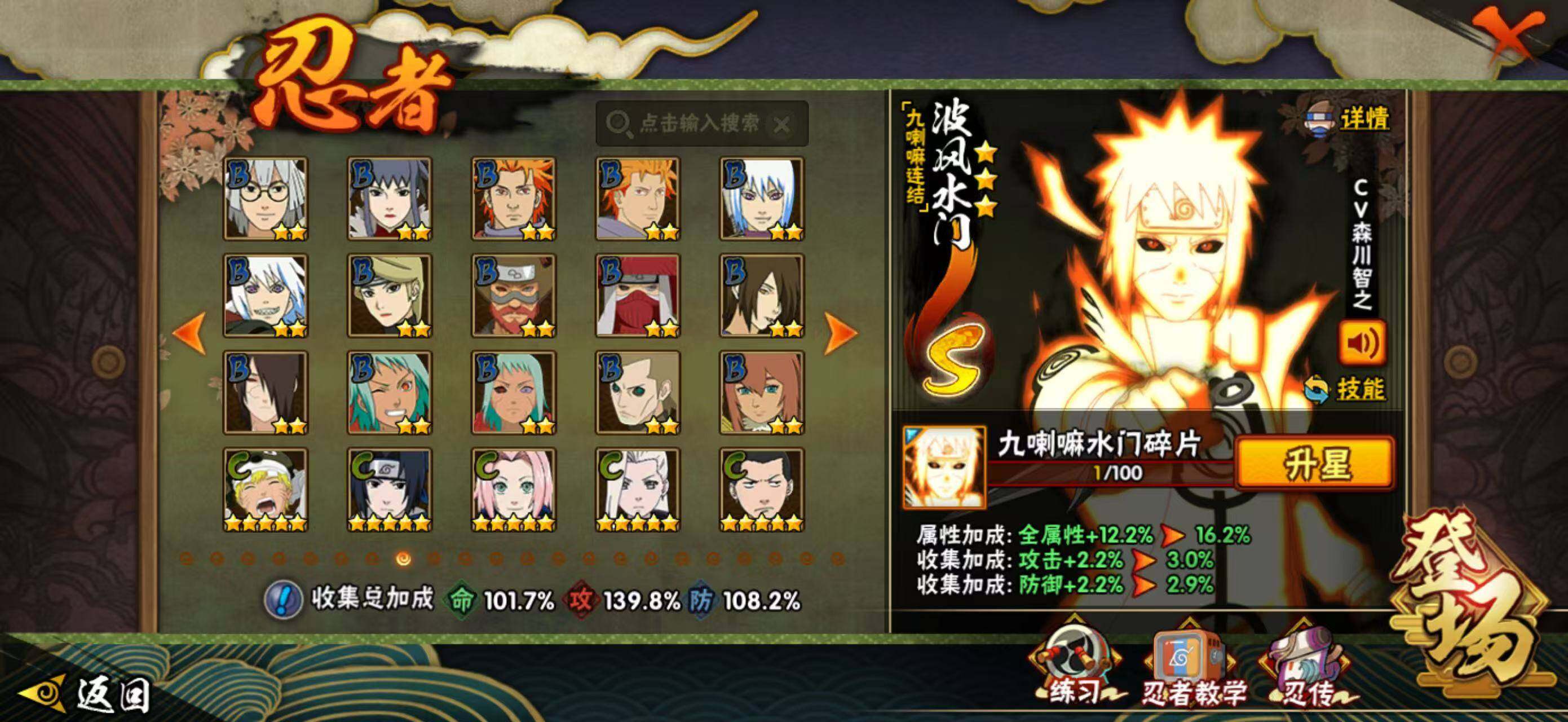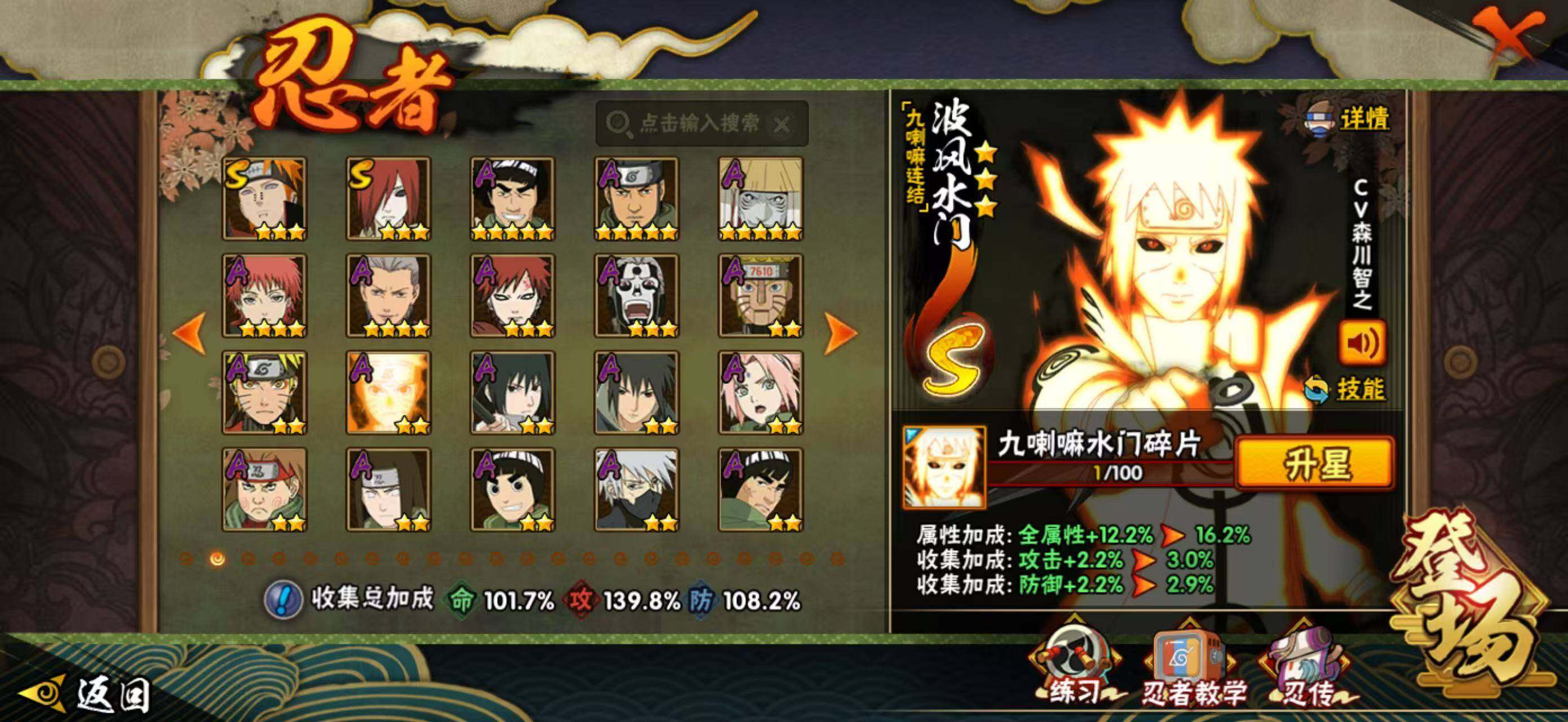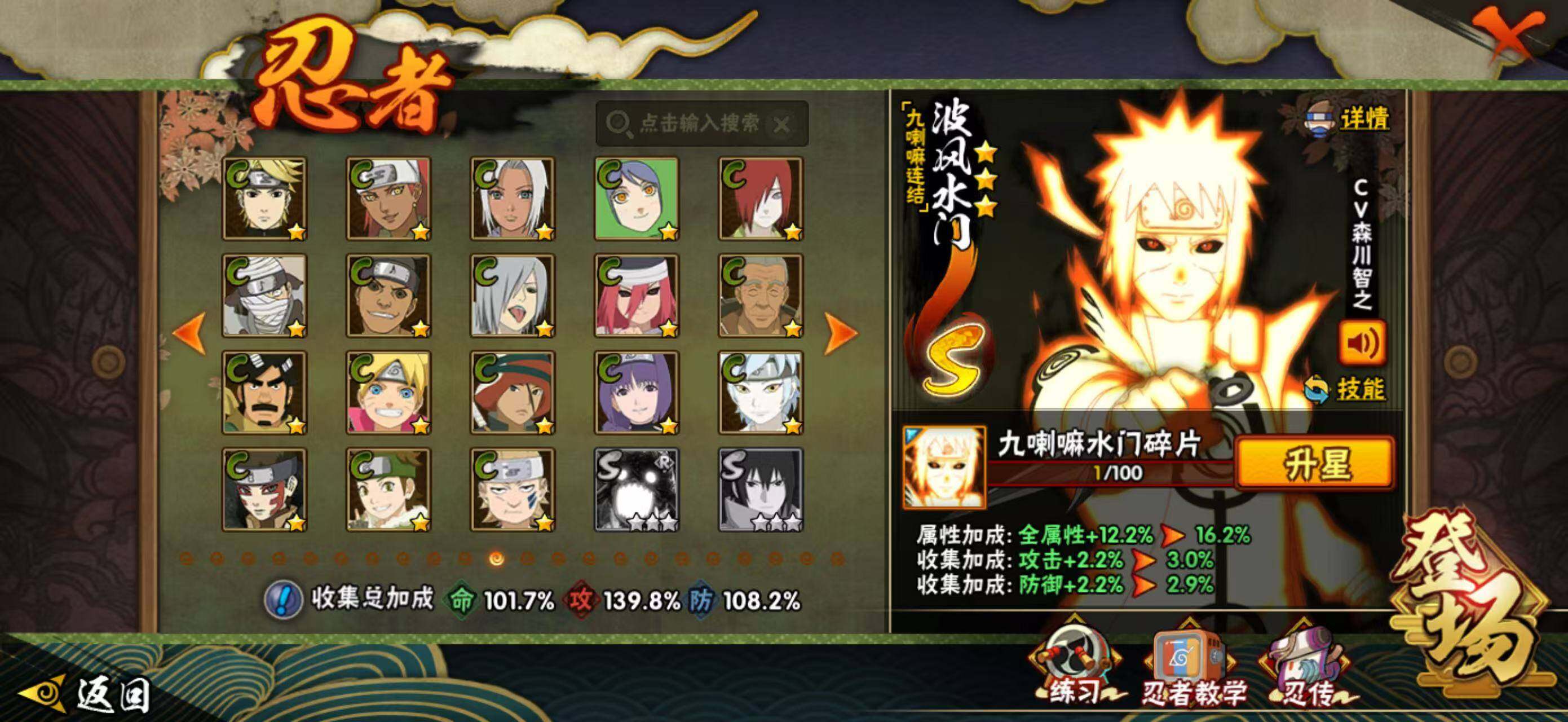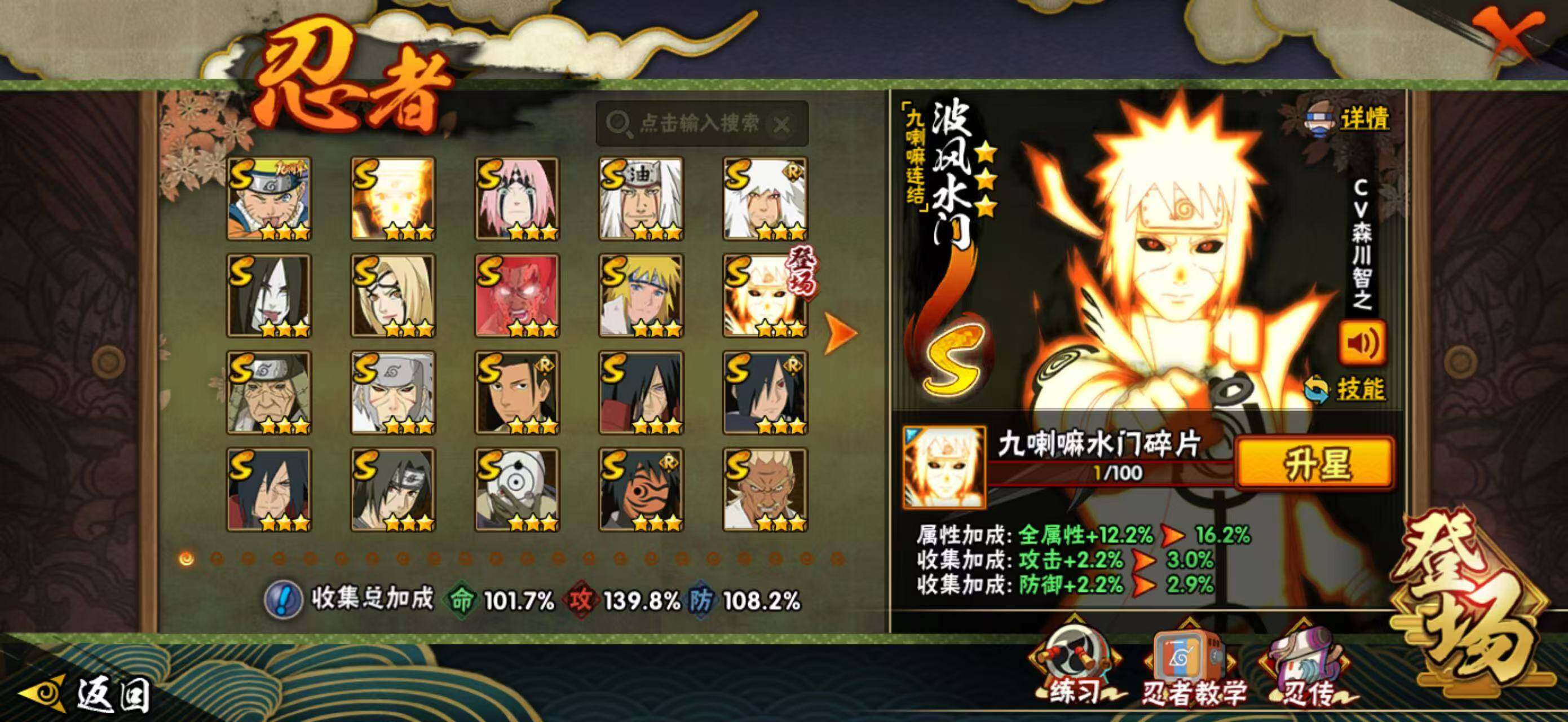 【S级忍者】:长门「秽土转生」(3星),猿飞日斩「秽土转生」(3星),千手扉间「秽土转生」(3星),宇智波斑「秽土转生」(3星),宇智波斑「秽土转生·解」(3星),春野樱「忍界大战」(3星),艾「忍界大战」(3星),宇智波鼬「须佐能乎」(3星),宇智波斑「木叶创立」(3星),千手柱间「木叶创立」(3星),自来也(3星),自来也「舞之豪杰」(3星),大蛇丸(3星),纲手「百豪」(3星),波风水门(3星),神秘面具男「红夜之刃」(3星),漩涡鸣