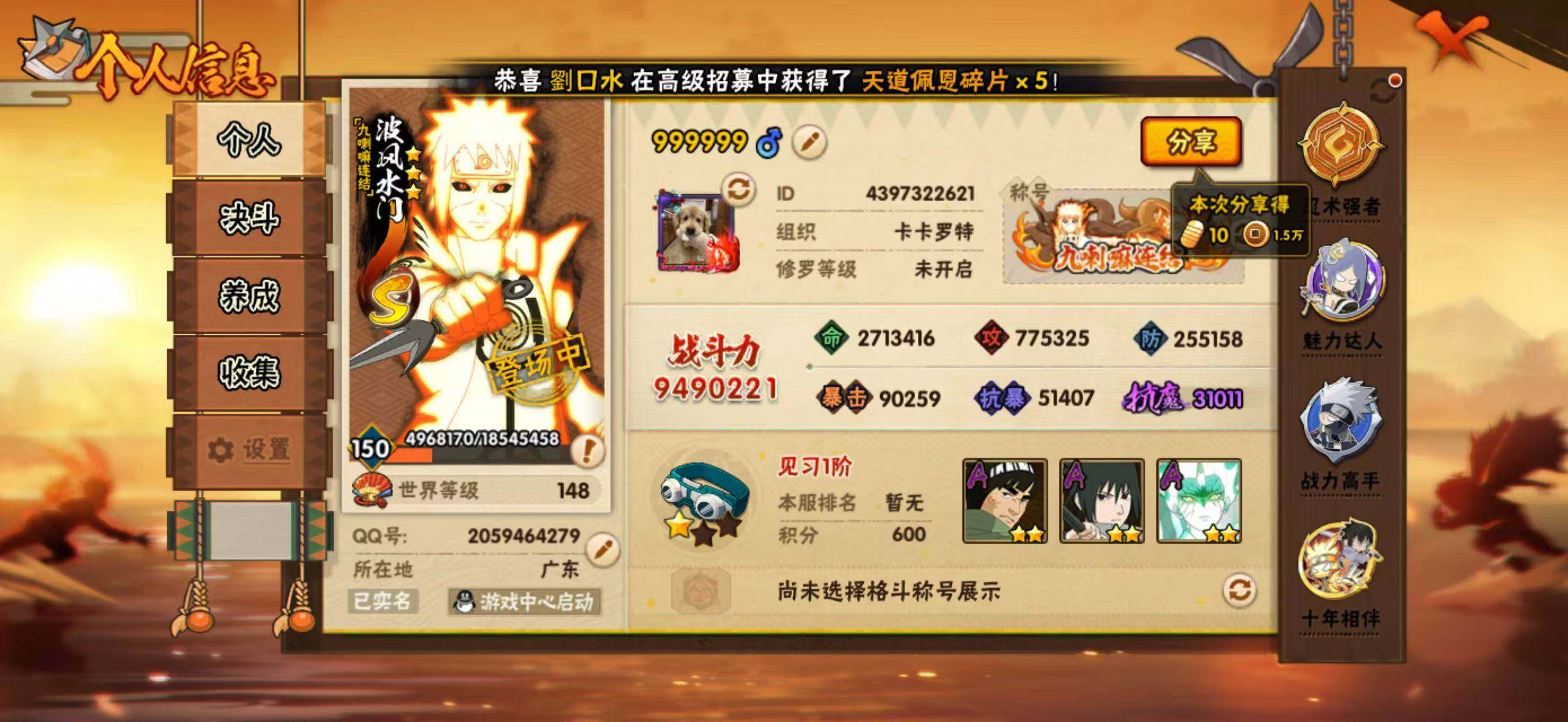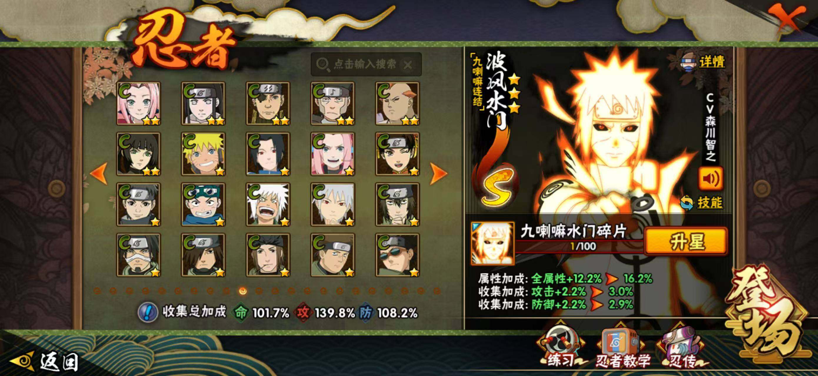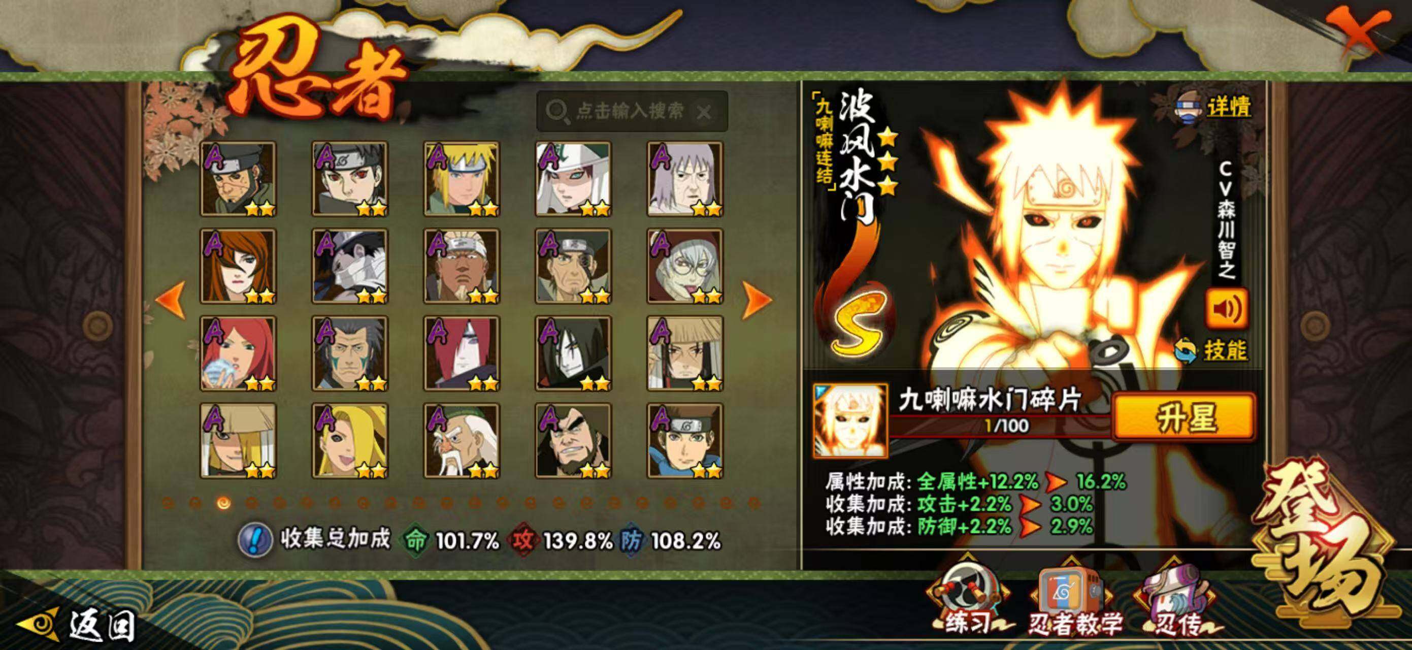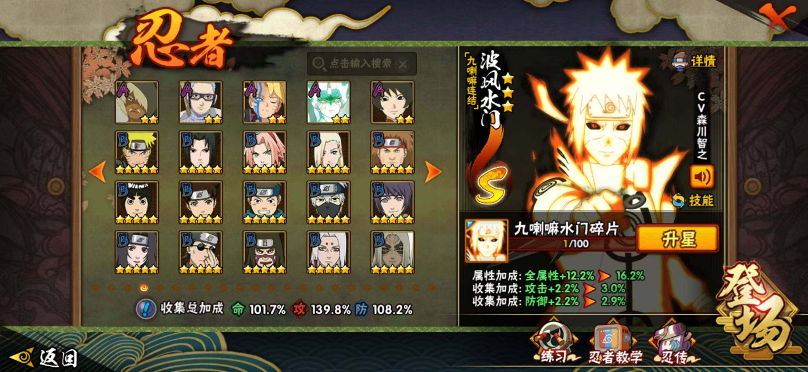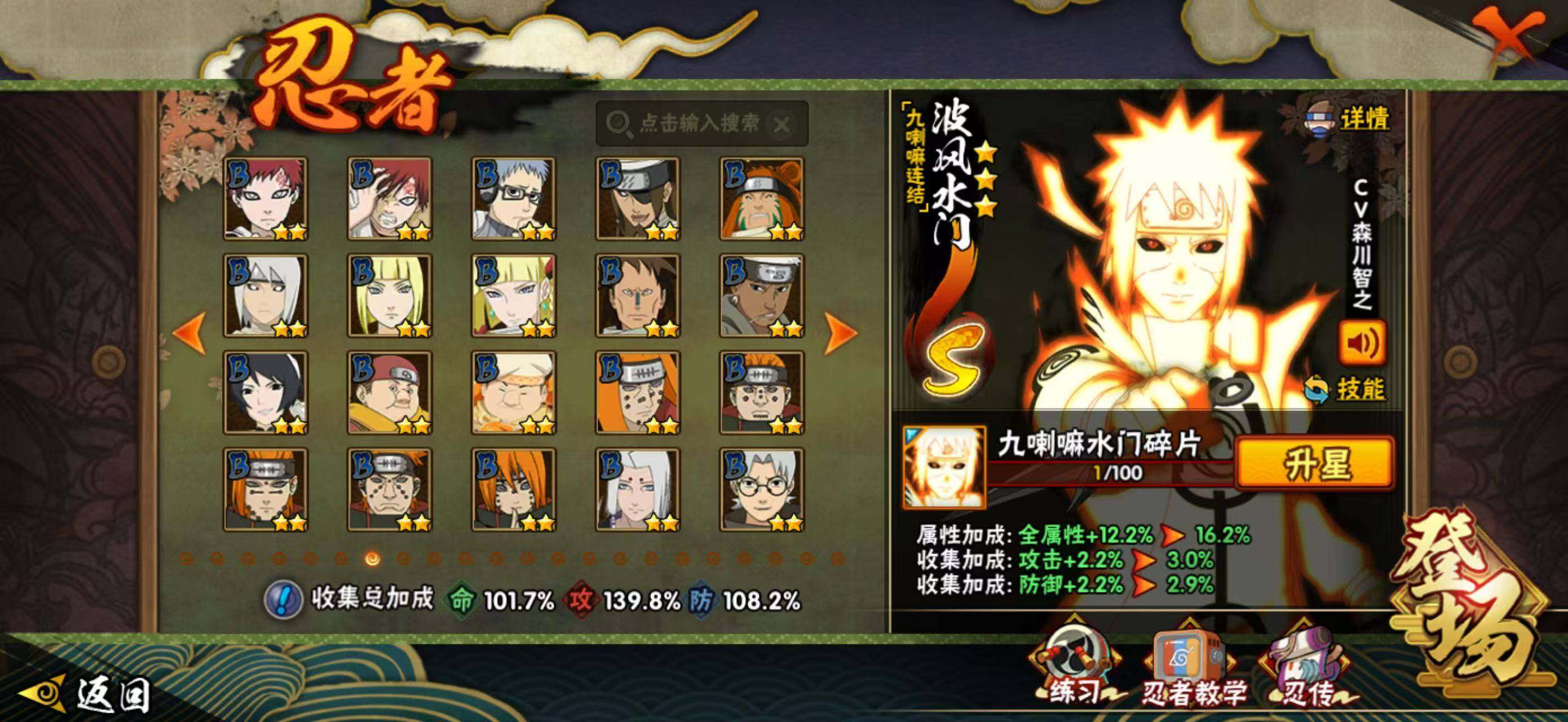 【S级忍者】:长门「秽土转生」(3星),猿飞日斩「秽土转生」(3星),千手扉间「秽土转生」(3星),宇智波斑「秽土转生」(3星),宇智波斑「秽土转生·解」(3星),春野樱「忍界大战」(3星),艾「忍界大战」(3星),宇智波鼬「须佐能乎」(3星),宇智波斑「木叶创立」(3星),千手柱间「木叶创立」(3星),自来也(3星),自来也「舞之豪杰」(3星),大蛇丸(3星),纲手「百豪」(3星),波风水门(3星),神秘面具男「红夜之刃」(3星),漩涡鸣