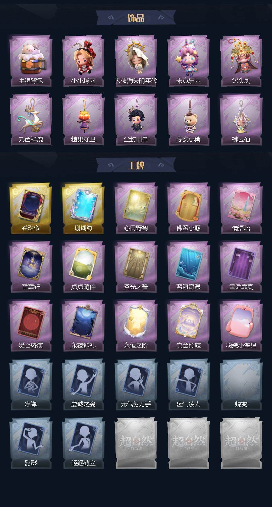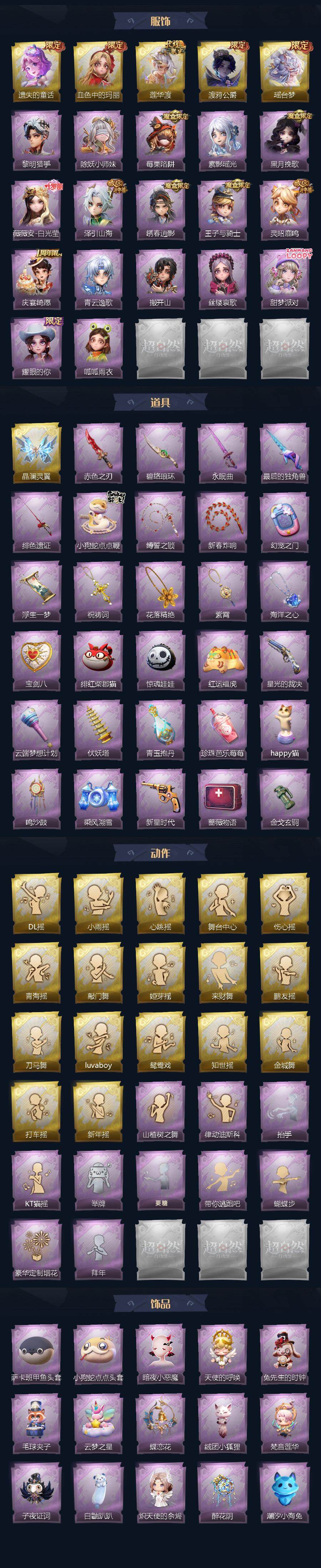 小黄-遗失的童话,爱丽丝-血色中的玛丽,逍遥-莲华渡,零-渡鸦公爵,莉莉-瑶台梦,艾伦-黎明猎手,莉莉-除妖小师妹,莉莉-莓果陷阱,巫铃儿-素影瑶光,薇薇安-黑月挽歌,薇薇安-白光莹,逍遥-泽引山海,逍遥-绣春逍影,阿念-王子与骑士,阿念-灵昭鹿鸣,阿念-庆宴绮愿,零-青云逸歌,零-搬开山,爱丽丝-丝缕哀歌,爱丽丝-甜梦派对,爱丽丝-耀眼的你,小黄-呱呱雨衣,喷气背包-晶澜灵翼,刺刀-赤色之刃,刺刀-碧络琅环,桃木剑-永眠曲,桃木剑-最后的独角兽,桃木剑-绯色遗证,长鞭-小狗蛇点点鞭,长鞭-缚誓