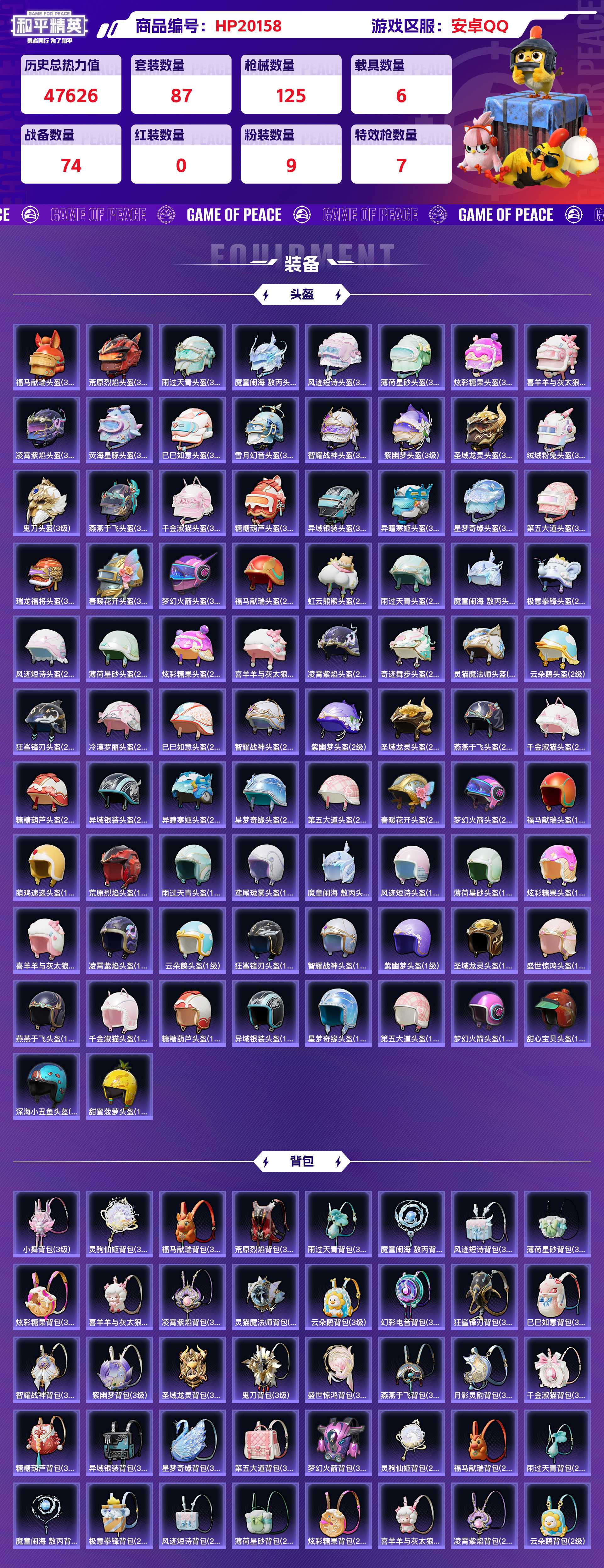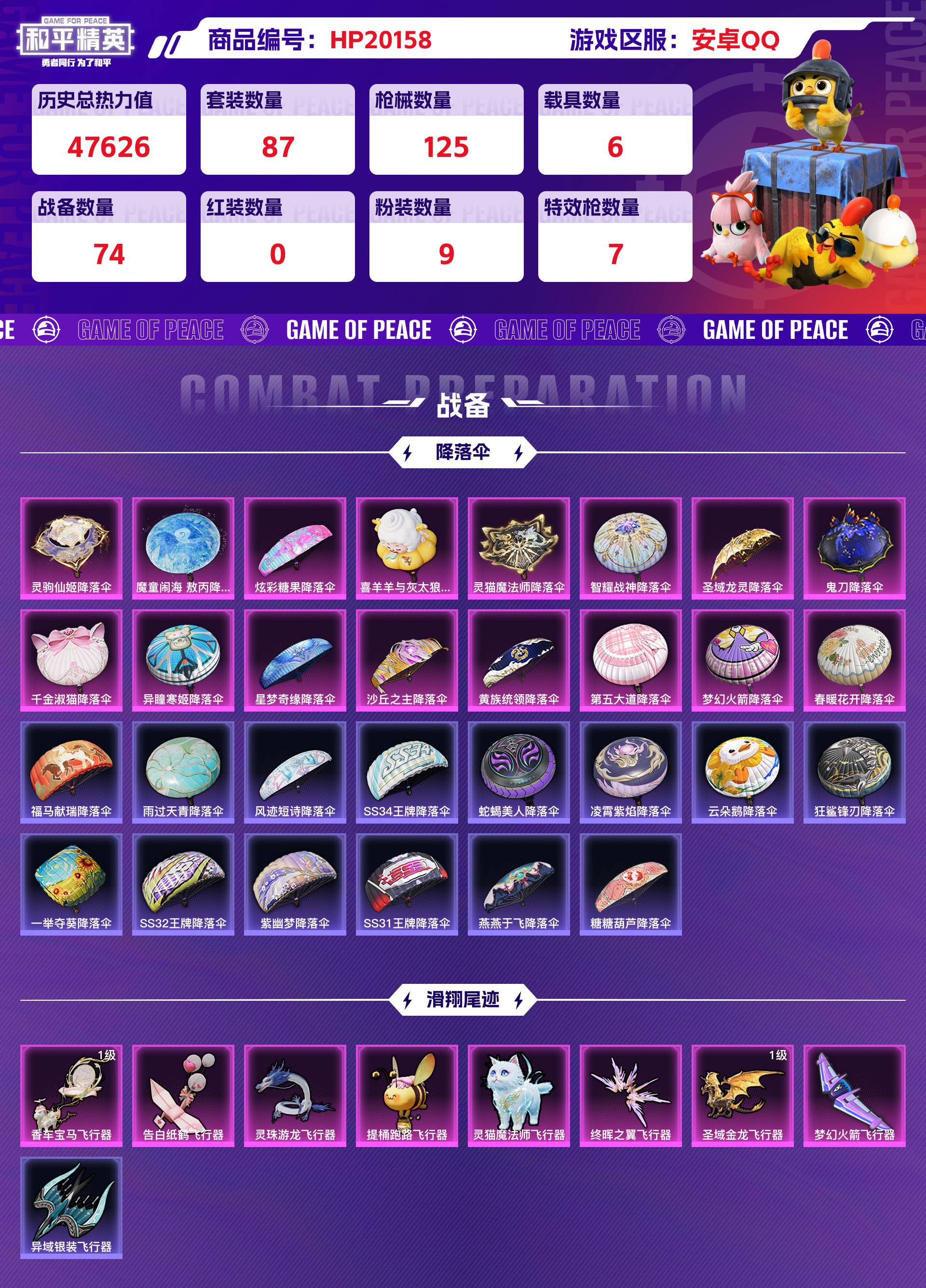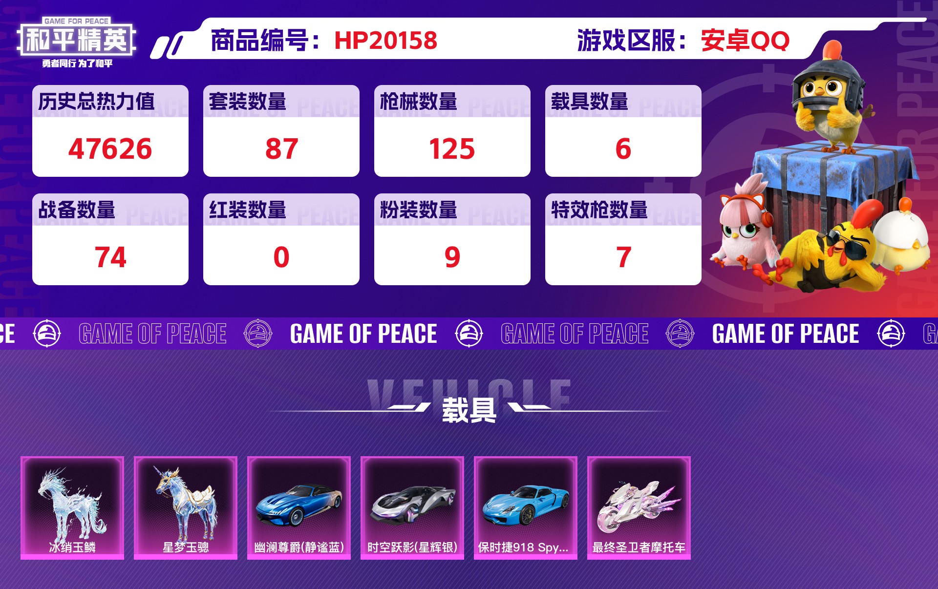 安卓QQ 历史总热力值:47626 粉装数量:9 特效枪数量:7 载具数量:6 王牌印记:4 历史最高段位:超级王牌10星 套装数量:87 时装数量:302 枪械数量:125 战备数量:74 装备数量:190 载具:冰绡玉鳞,星梦玉骢,保时捷918 Spyder(沉静蓝),时空跃影(星辉银),最终圣卫者摩托车,幽澜尊爵(静谧蓝) 时装:套装-幻彩电音,套装-梦幻火箭,角色-千金淑猫,角色-天穹,角色-星梦奇缘,角色-智耀战神,角色-羊梦糖心,角色-花灵,角色-荧海星豚,套装-SS24特训,套装-