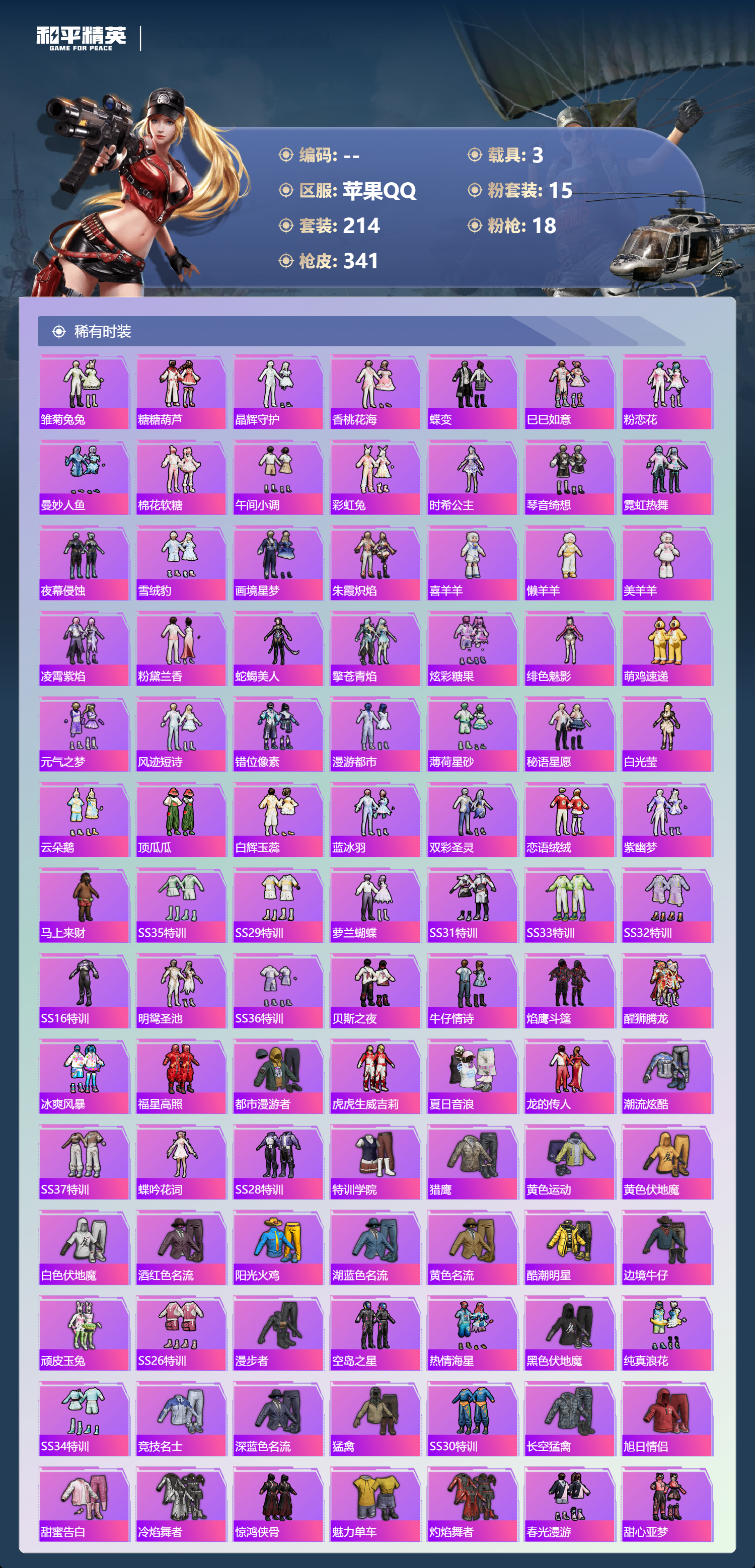 hs66149 苹果手Q-11王牌印记-3红装-15粉装-18特效枪-3载具-热力值-214套装-341枪皮-2卓越印记