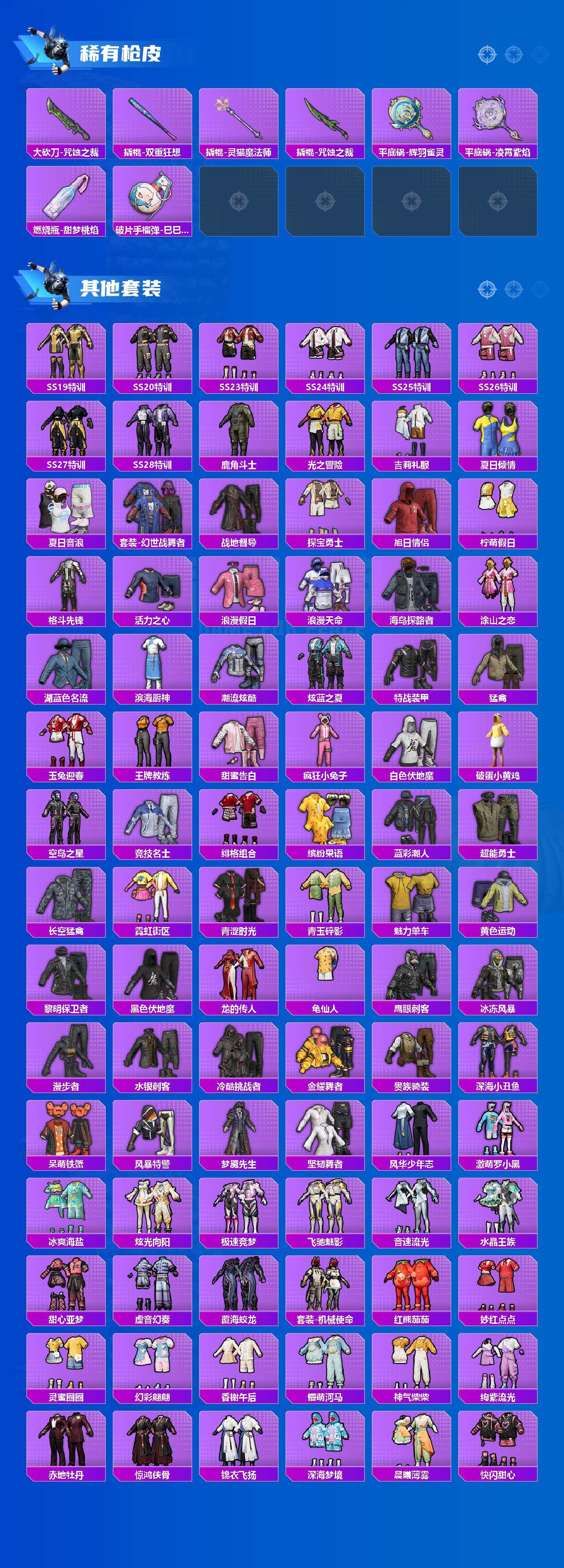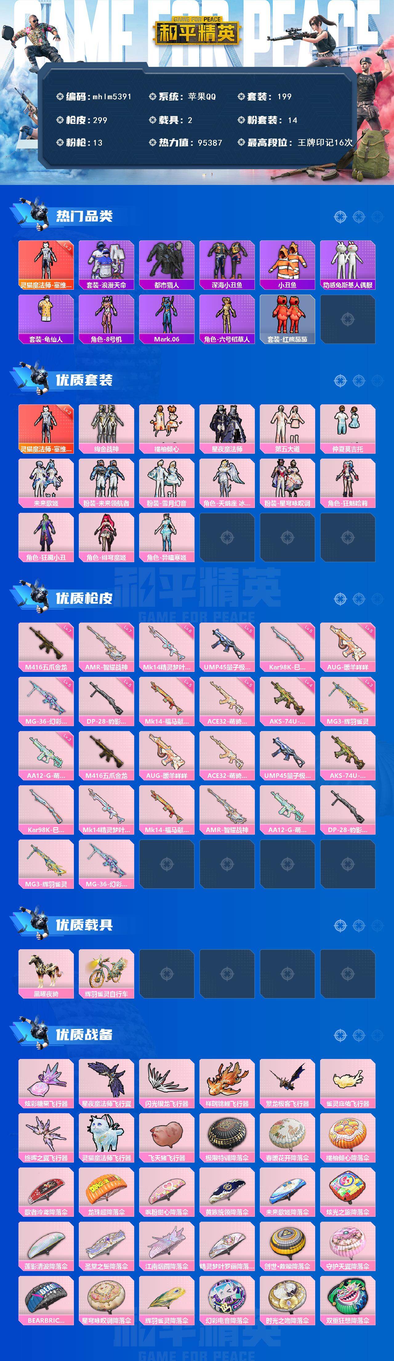 苹果 手Q-1神装-14粉装-13特效枪-2载具-9粉色飞行器-95387热力值-16王牌印记-199套装-299枪皮