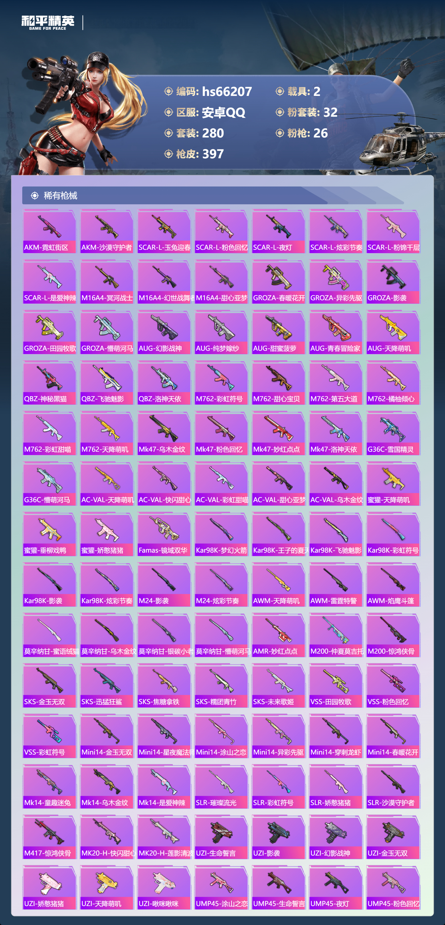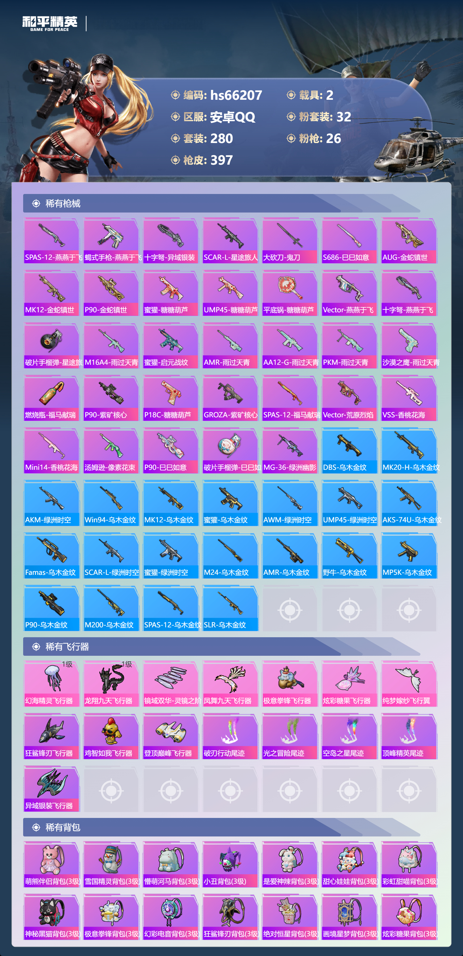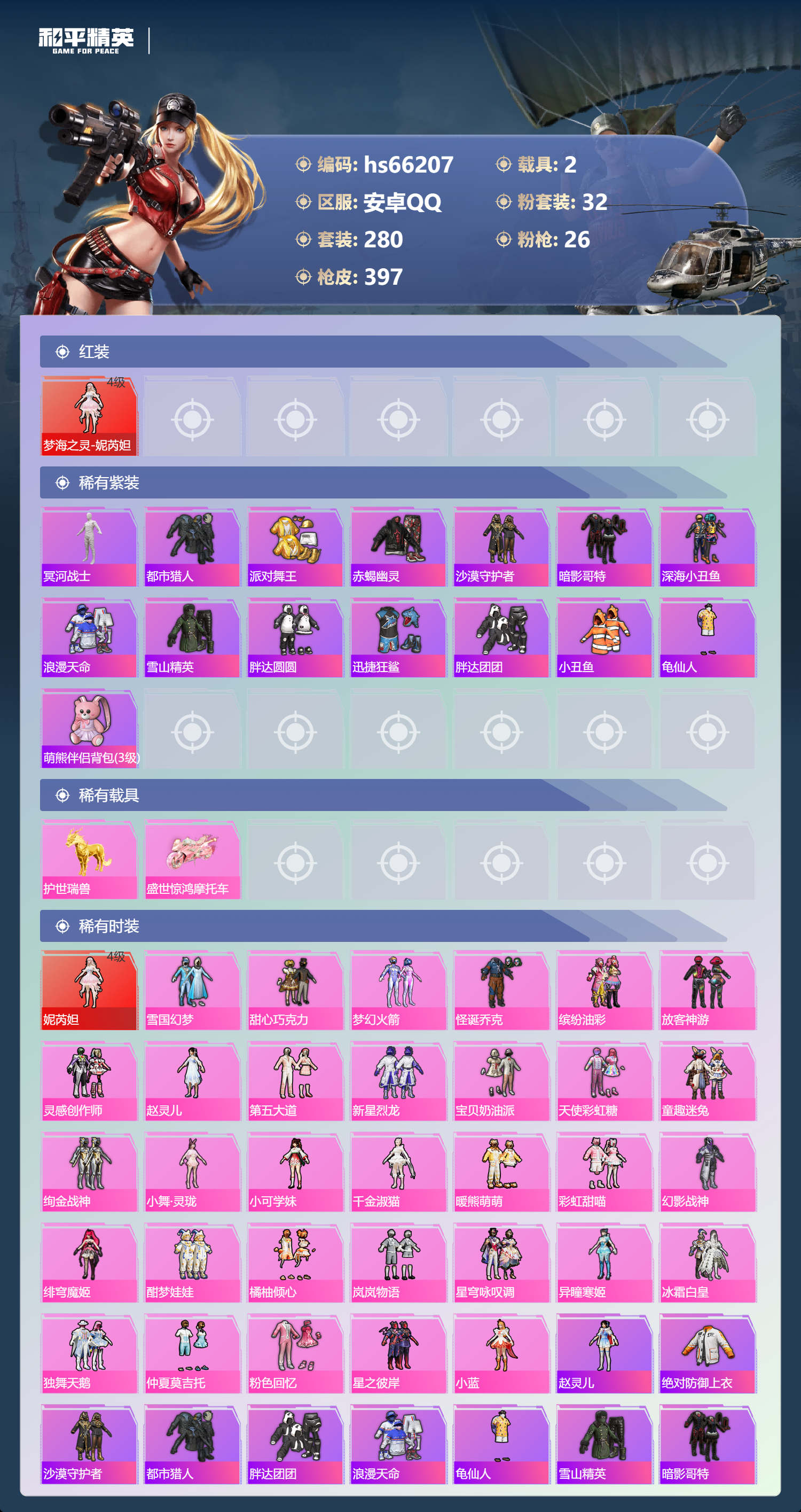 hs66207 安卓手Q-20王牌印记-有战神框-1红装-32粉装-26特效枪-2载具-热力值-280套装-397枪皮-15卓越印记-15传奇印记