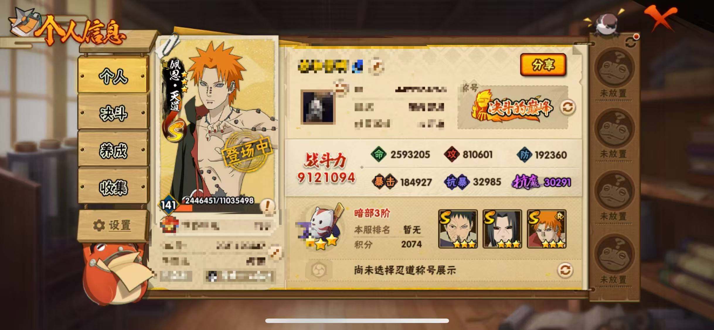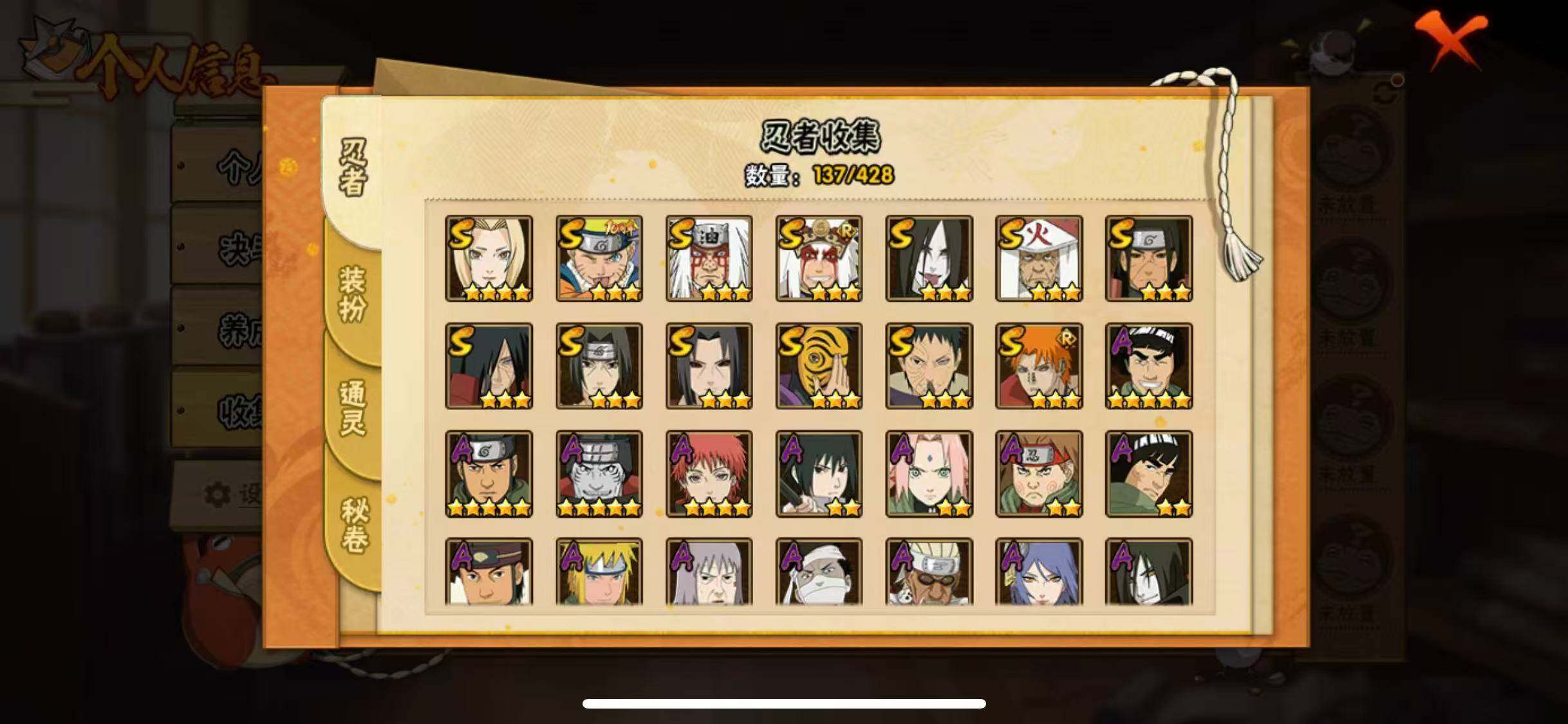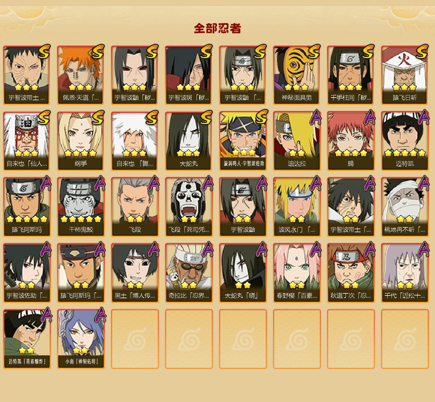 【S级忍者】:千手柱间「秽土转生」(3星),宇智波鼬「秽土转生」(3星),宇智波斑「秽土转生」(3星),宇智波带土「忍界大战」(3星),宇智波鼬「须佐能乎」(3星),自来也「仙人模式」(3星),自来也「舞之豪杰」(3星),大蛇丸(3星),纲手(4星),猿飞日斩(3星),神秘面具男(3星),佩恩·天道「超」(3星),漩涡鸣人·宇智波佐助(3星)