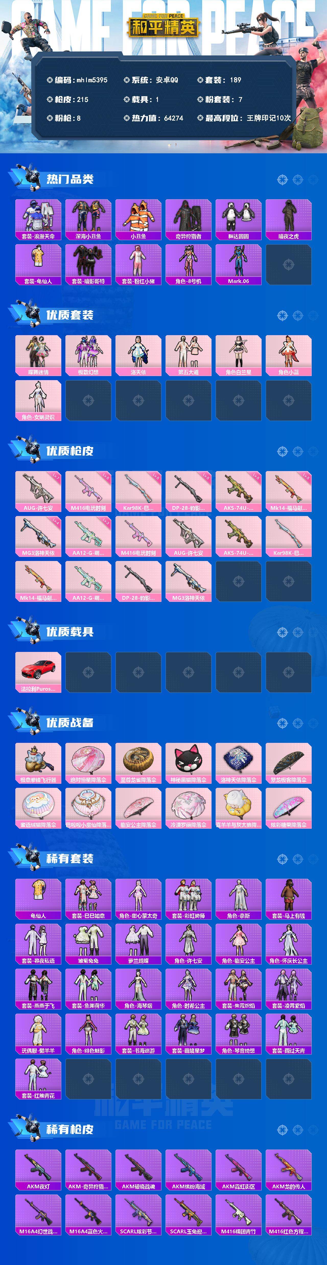 安卓 手Q-7粉装-8特效枪-1载具-1粉色飞行器-64274热力值-10王牌印记-189套装-215枪皮