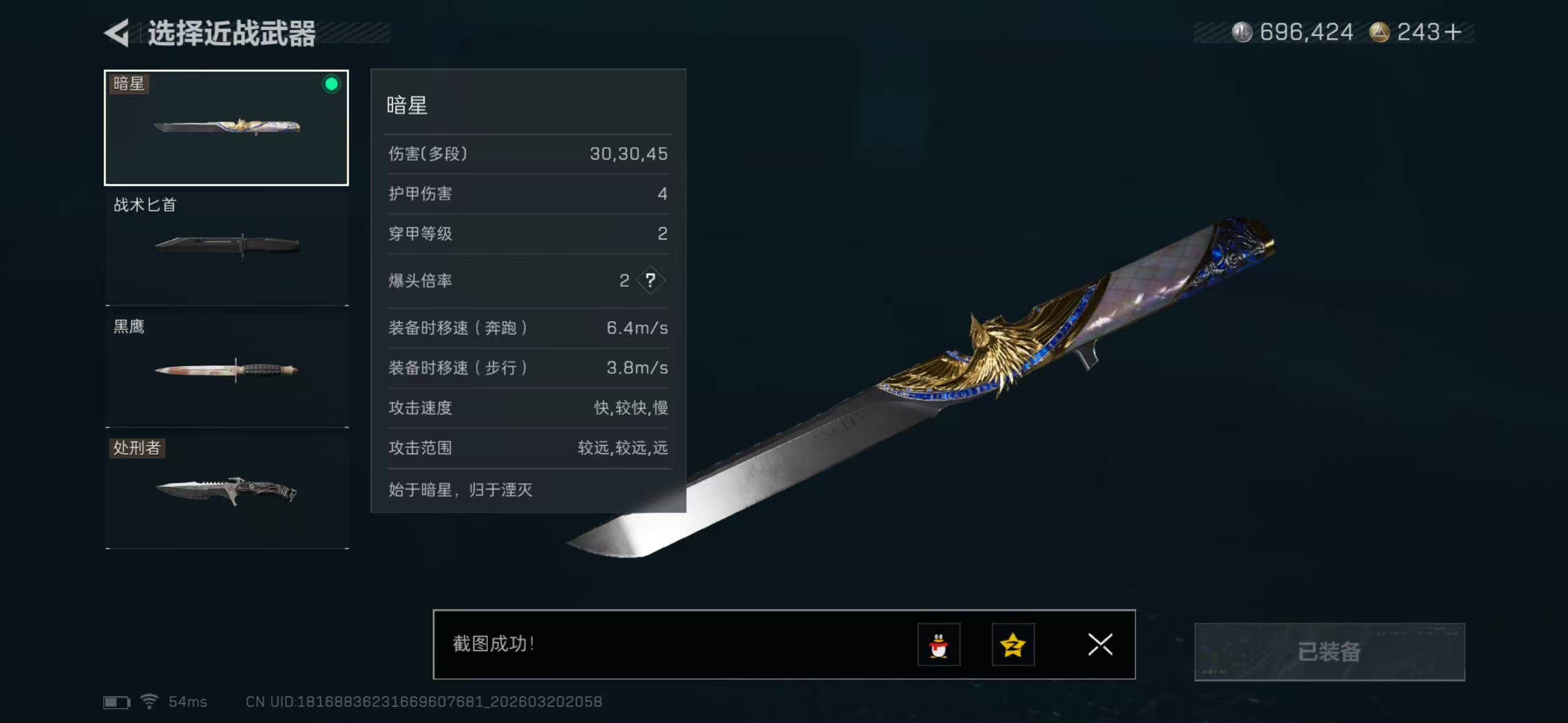 【近战皮肤】:近战-暗星,近战-处刑者2级,近战-黑鹰