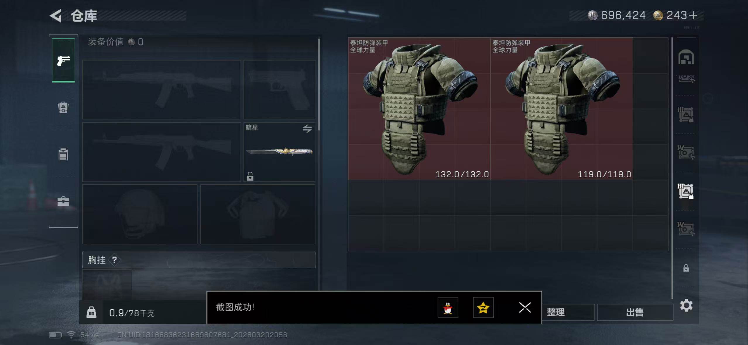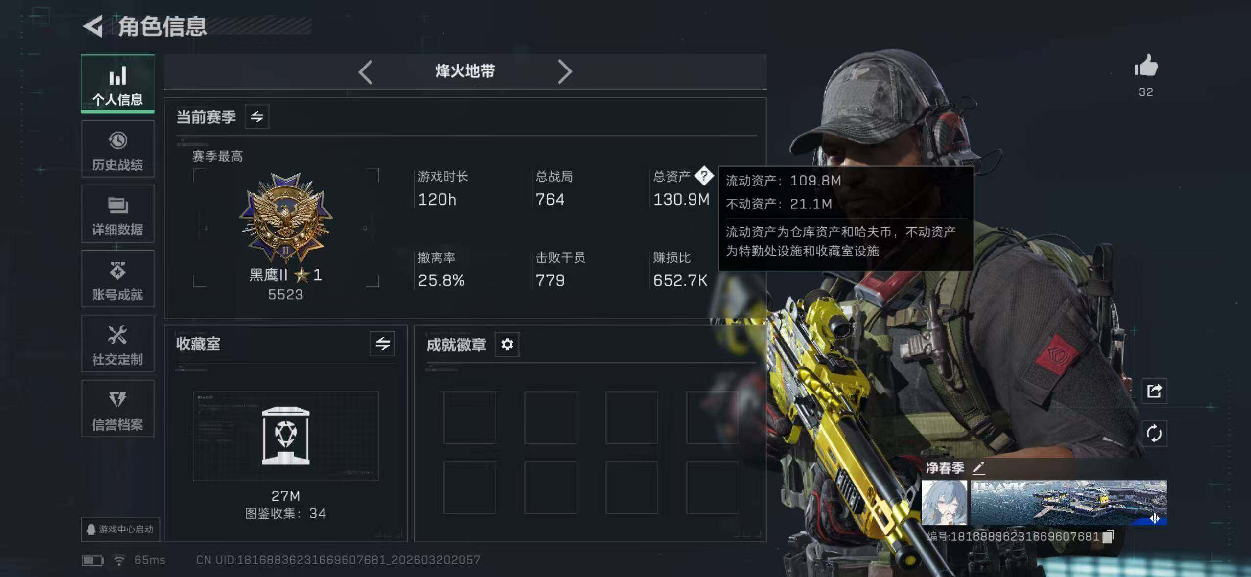 【SJ1484】130m总资产-696k哈夫币-60烽火等级-黑鹰-26战场等级-军士长