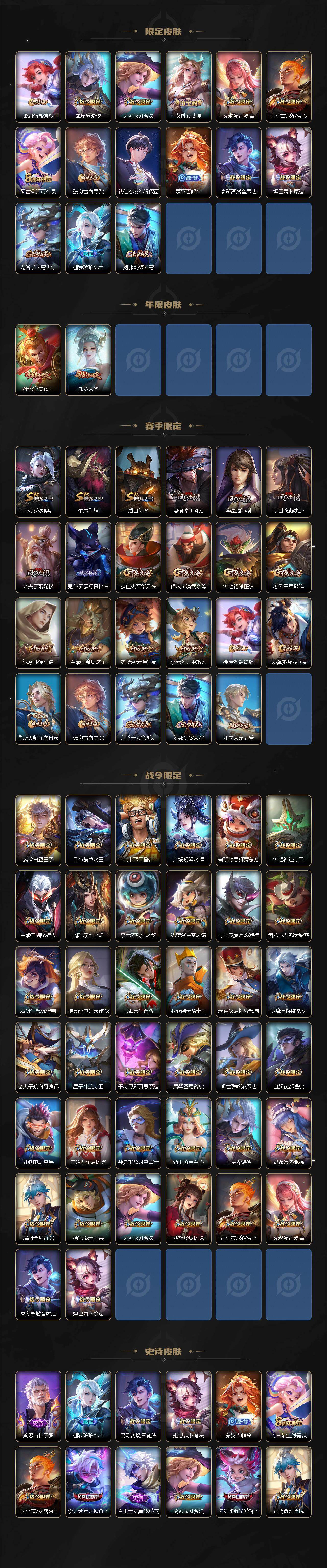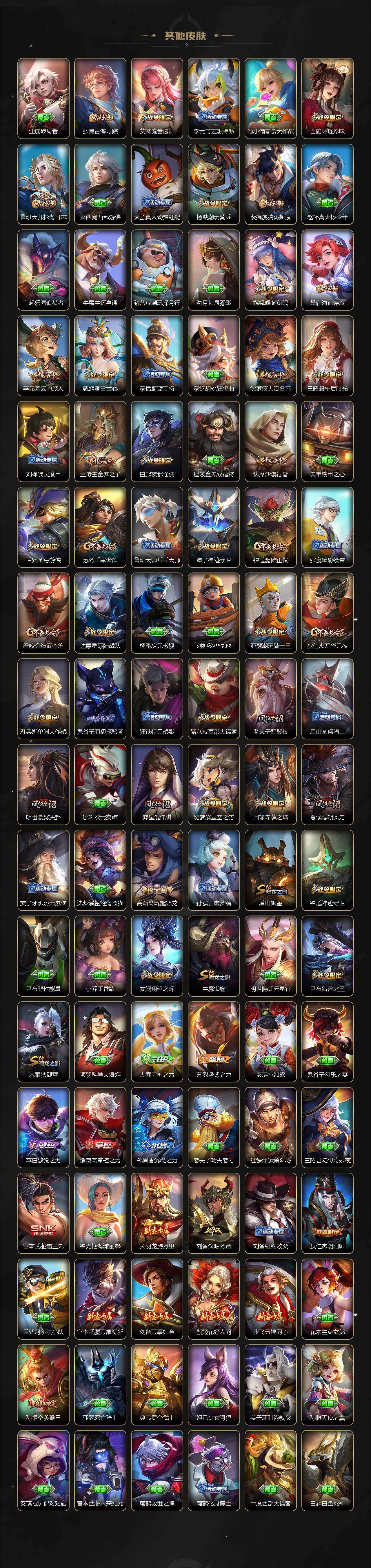 【传说皮肤】:桑启鸣野蒿,狄仁杰夜礼服假面,宫本武藏惊梅引,澜电玩雷克斯,吕布怒海麟威,周瑜音你心动,李元芳飞鸢探春,兰陵王默契交锋,铠绛天战甲,虞姬启明星使,曜云鹰飞将,李信一念神魔,伽罗太华,张良黄金白羊座,貂蝉仲夏夜之梦,孙尚香末日机甲,宫本武藏地狱之眼