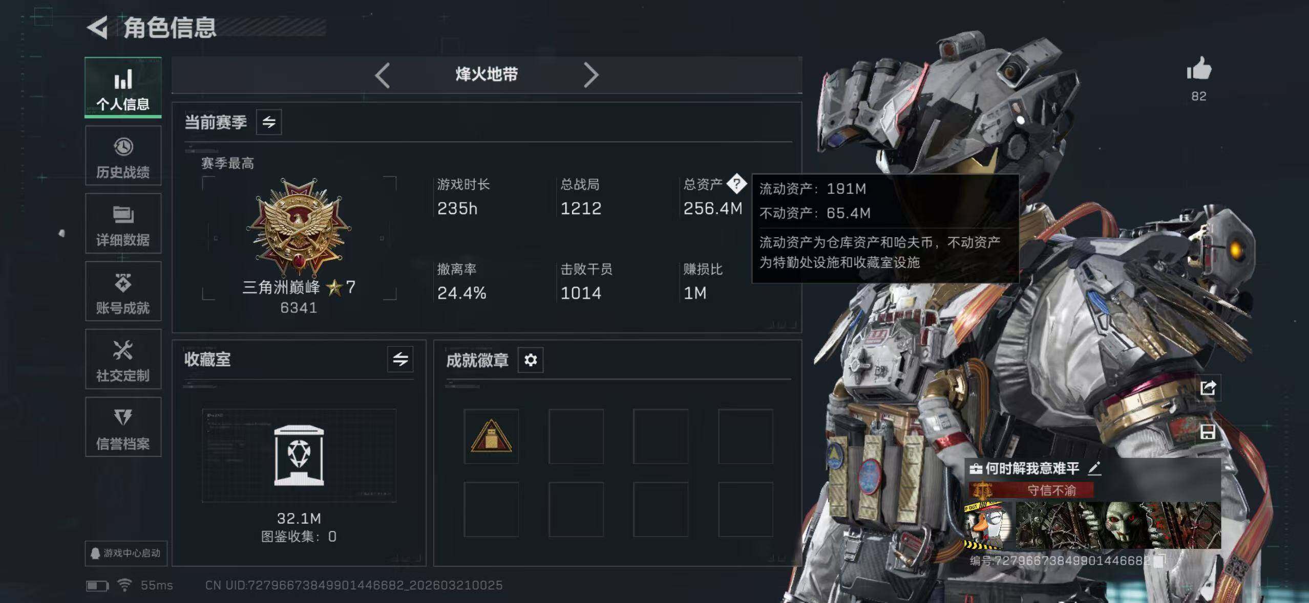 【SJ1487】256m总资产-101791k哈夫币-60烽火等级-黑鹰-43战场等级-上等兵