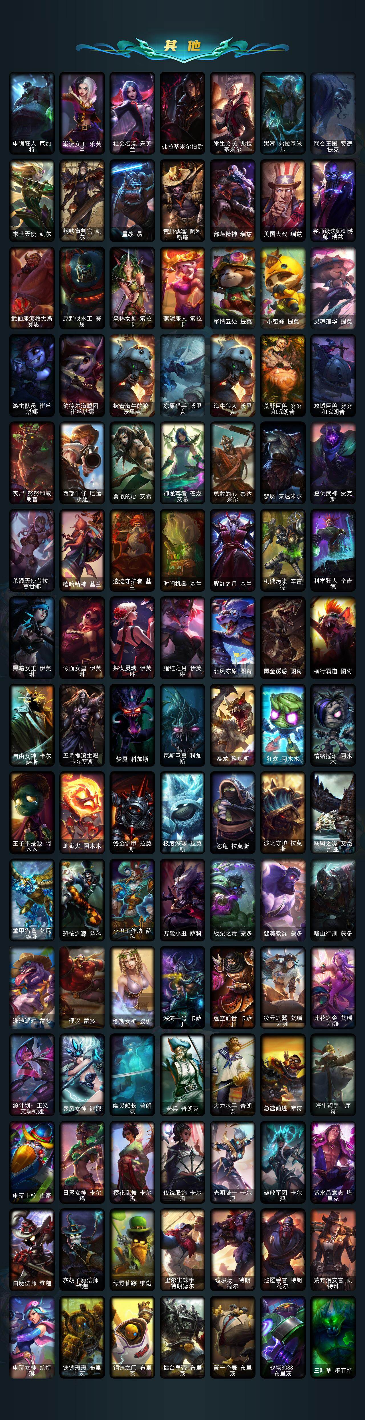 【年限皮肤】:龙的传人李青,银龙裁决泰隆,你看见过我的熊猫吗安妮,神龙之翼库奇,替父从军花木兰,广寒仙子嫦娥,神龙烈焰金克丝,美猴王孙悟空,紫金罗刹莫甘娜,虎痴之拳蔚,金猪烈焰瑟庄妮,福