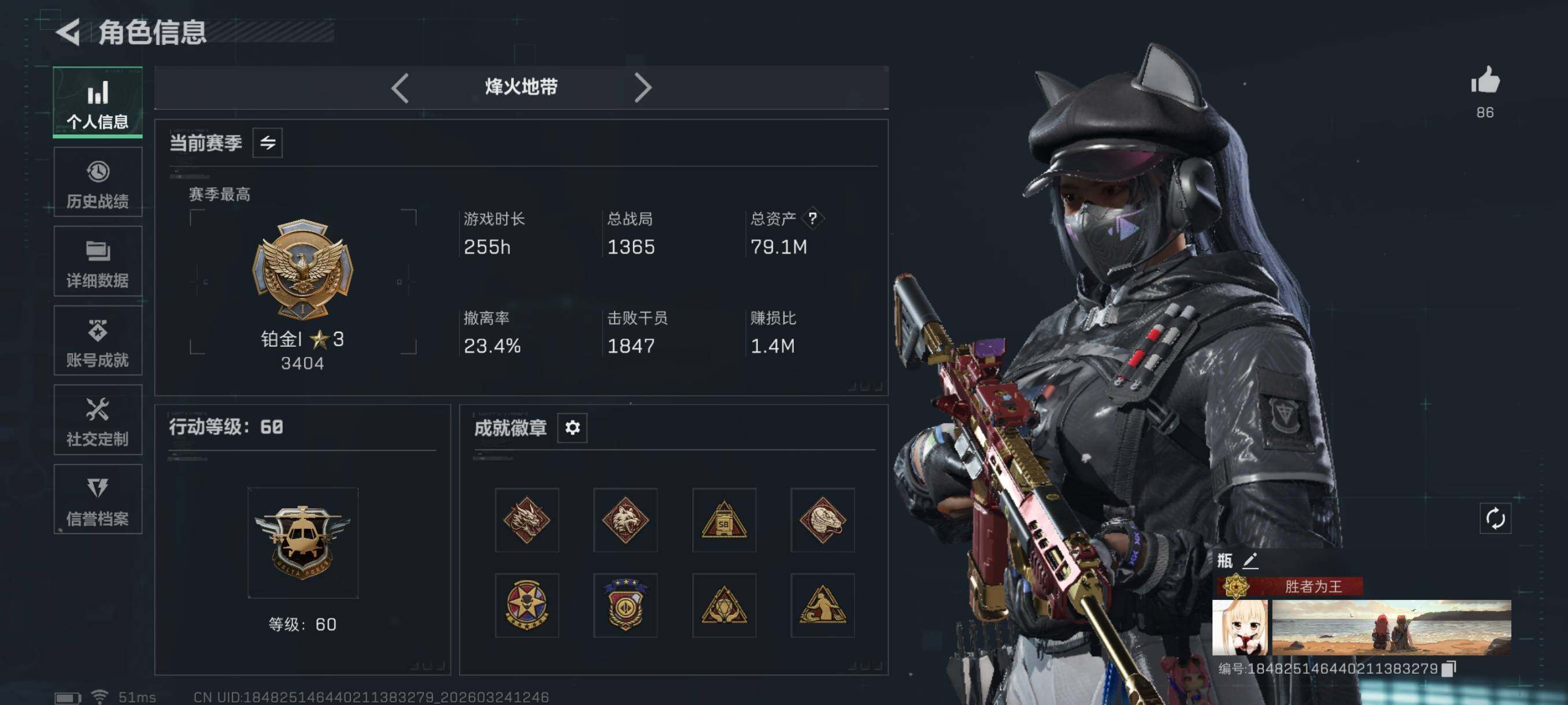 特价出售}等级:60总资产:79.1M 纯币11842k 红皮:飞虎 凌霄戍卫 蚀金玫瑰 天际线 刀皮:信条 特勤处:仓库5,训练6,靶场4部门22211