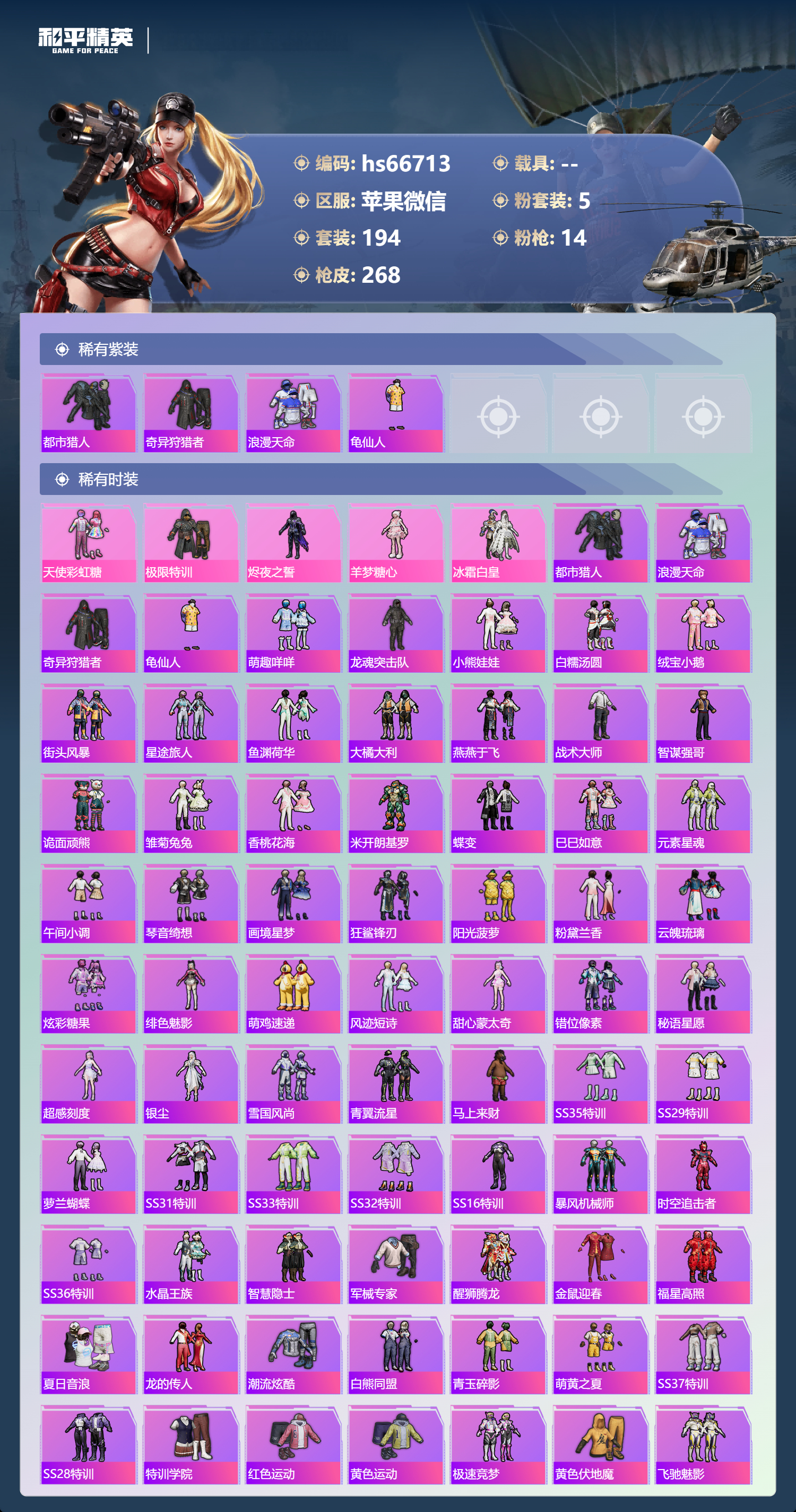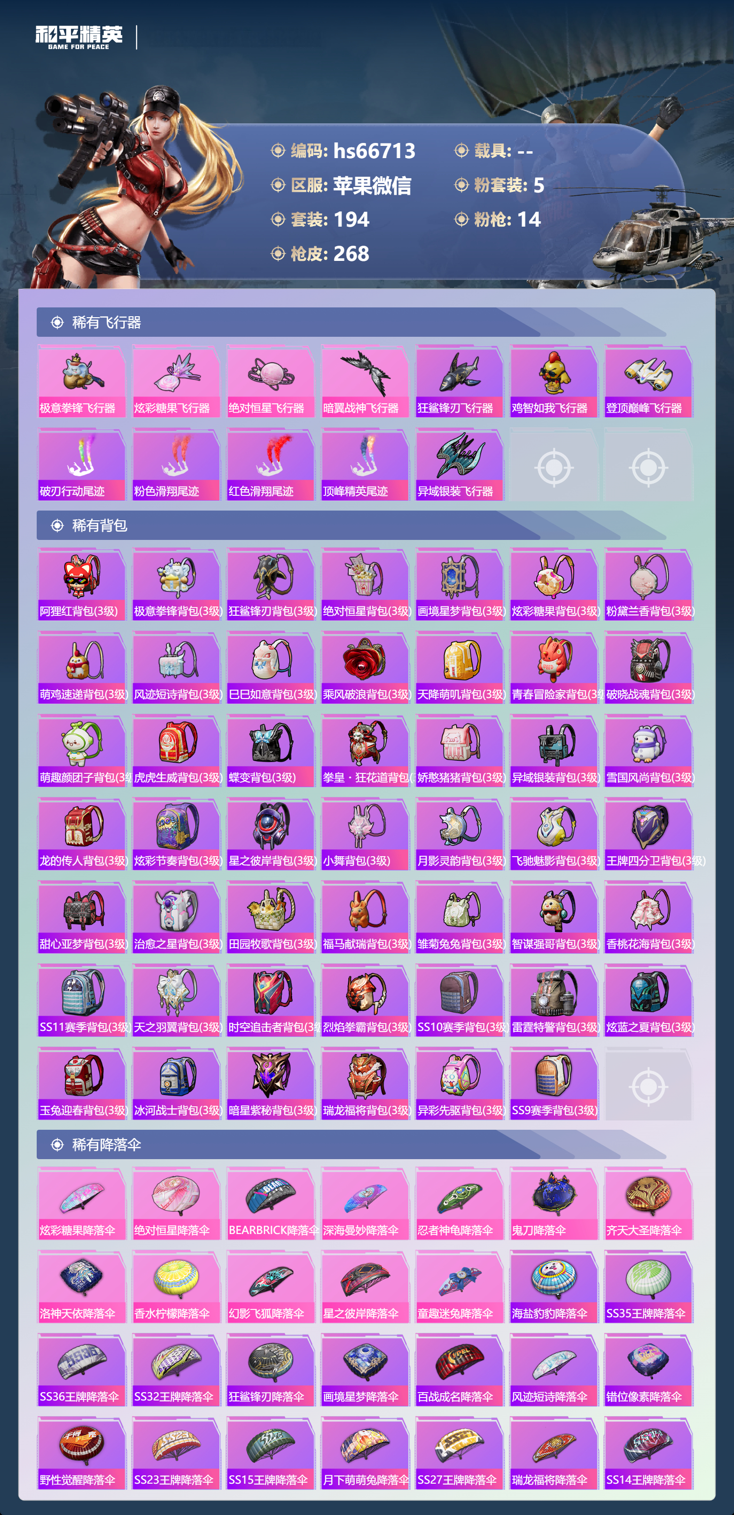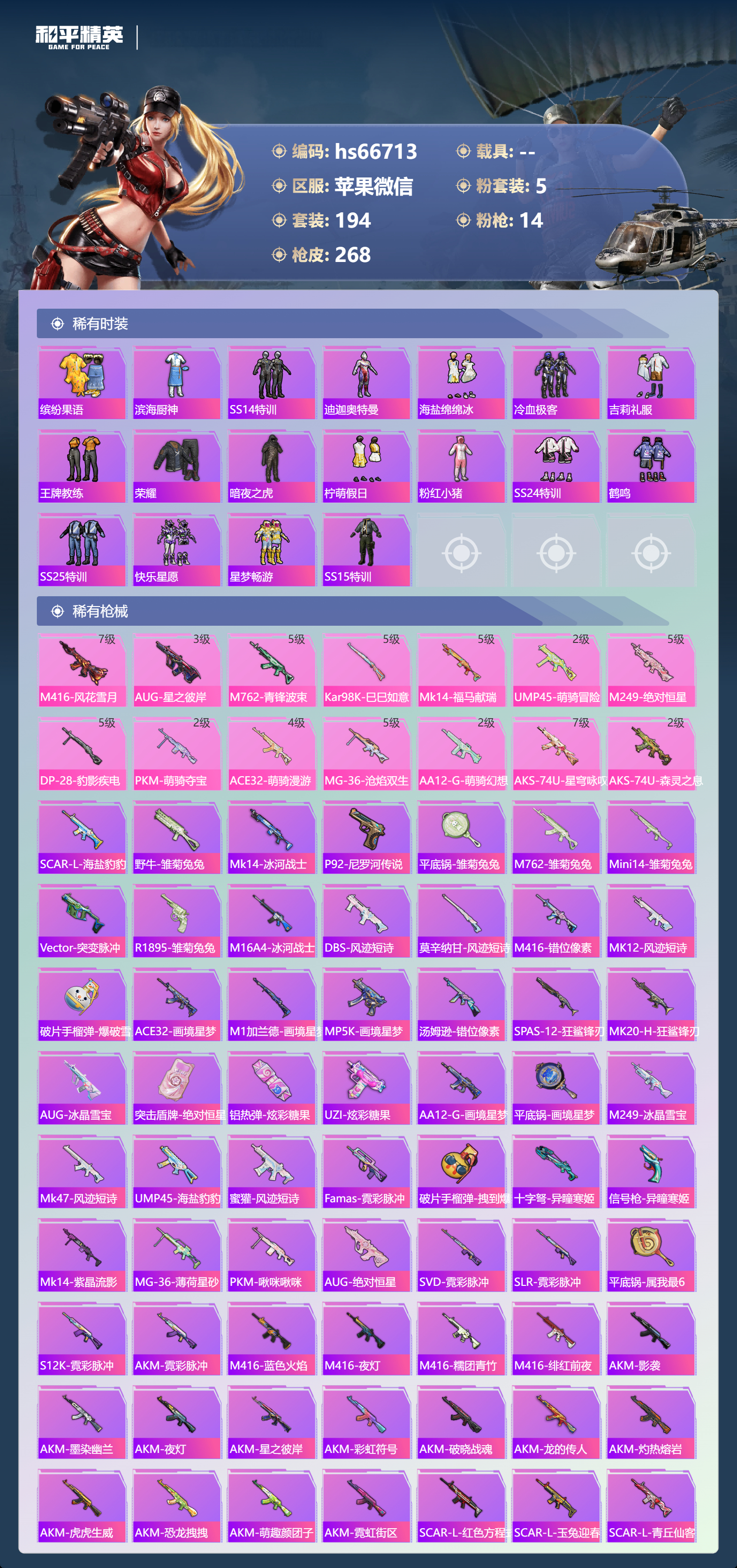 hs66713 苹果微信-23王牌印记-5粉装-14特效枪-81432热力值-194套装-268枪皮-4卓越印记-1传奇印记