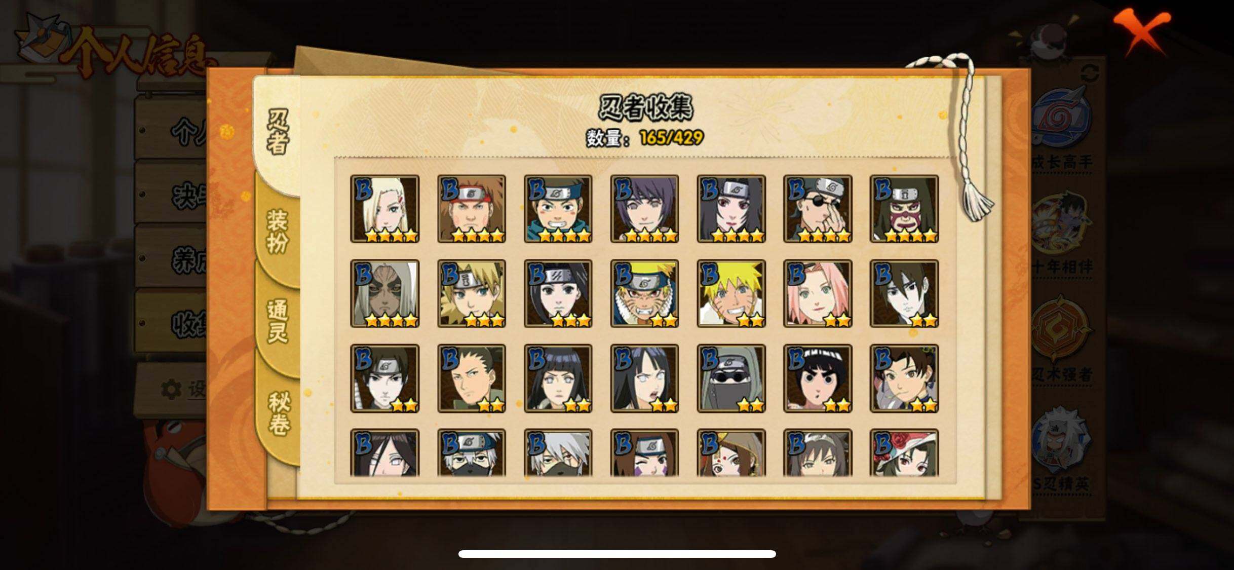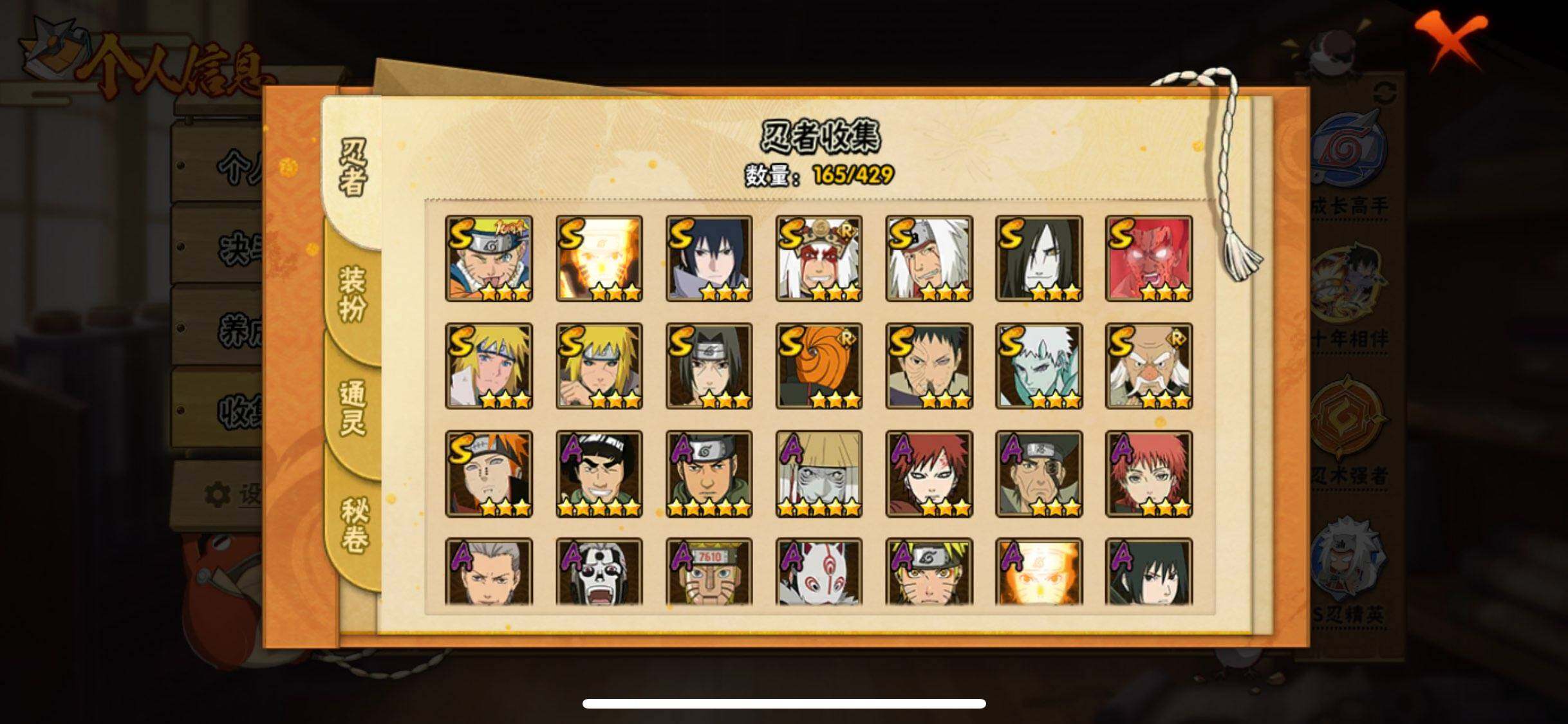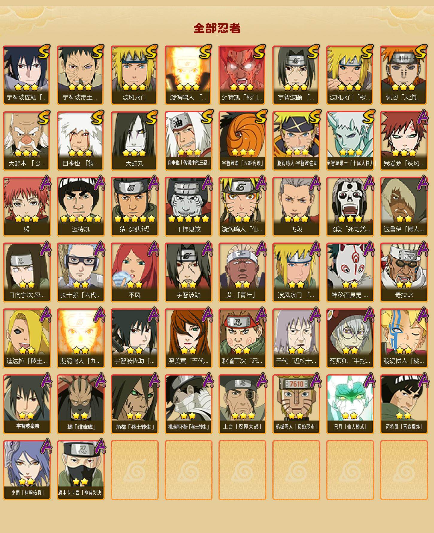 【S级忍者】:波风水门「秽土转生」(3星),大野木「忍界大战」(3星),宇智波带土「忍界大战」(3星),宇智波鼬「须佐能乎」(3星),自来也「舞之豪杰」(3星),大蛇丸(3星),自来也「传说中的三忍」(3星),波风水门(3星),漩涡鸣人「九喇嘛连结」(3星),迈特凯「死门」(3星),佩恩「天道」(3星),宇智波佐助「永恒万花筒」(3星),宇智波斑「五影会谈」(3星),漩涡鸣人·宇智波佐助(3星),宇智波带土「十尾人柱力」(3星)