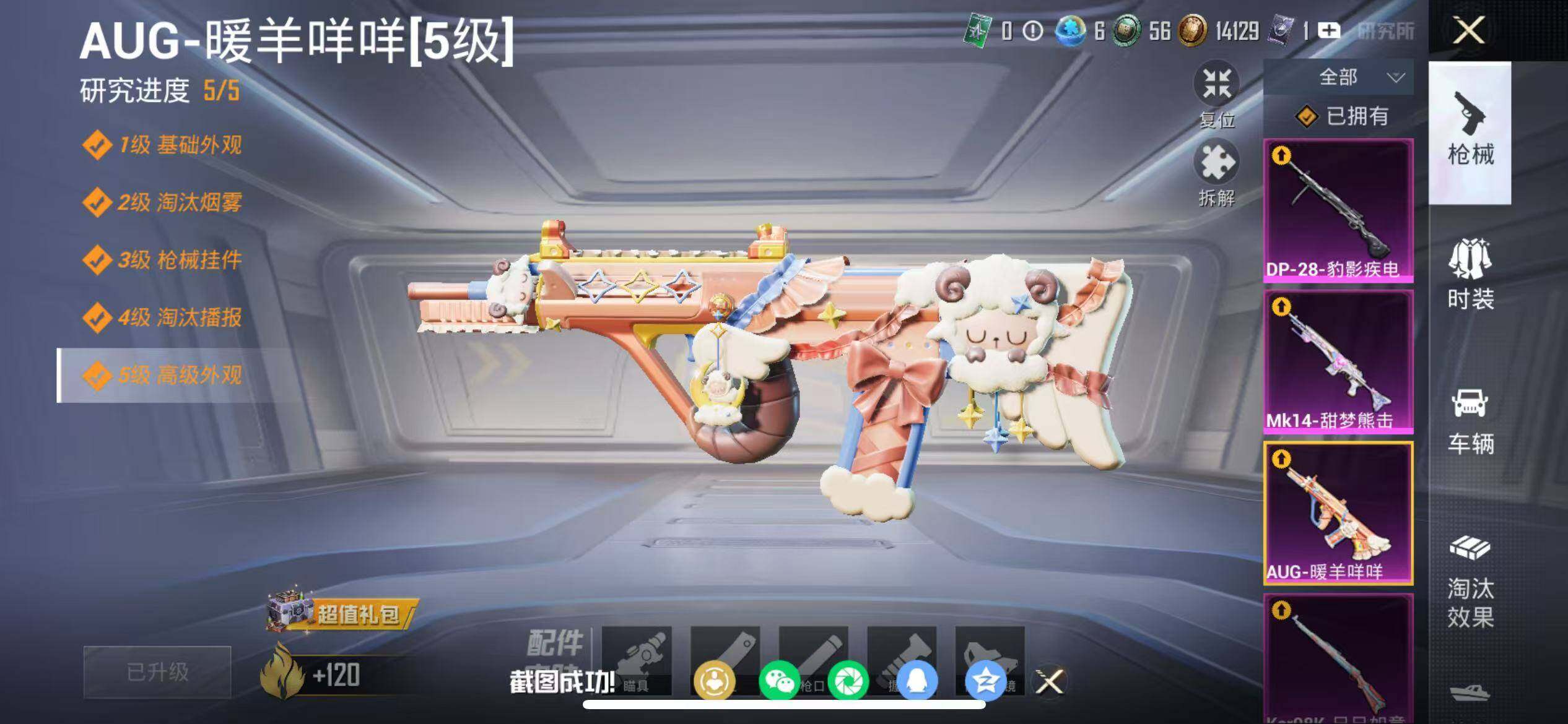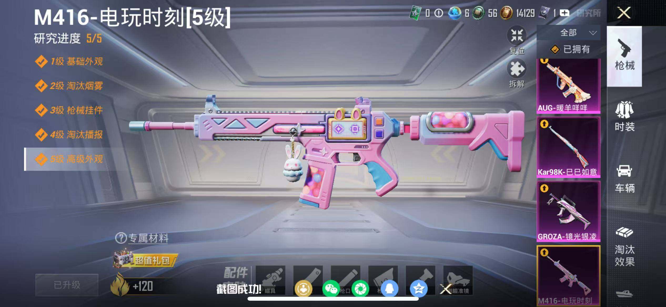 【粉色枪皮等级】:M416-电玩时刻(五级),GROZA-镜光银凌(五级),AUG-暖羊咩咩(五级),Kar98K-巳巳如意(五级),Mk1